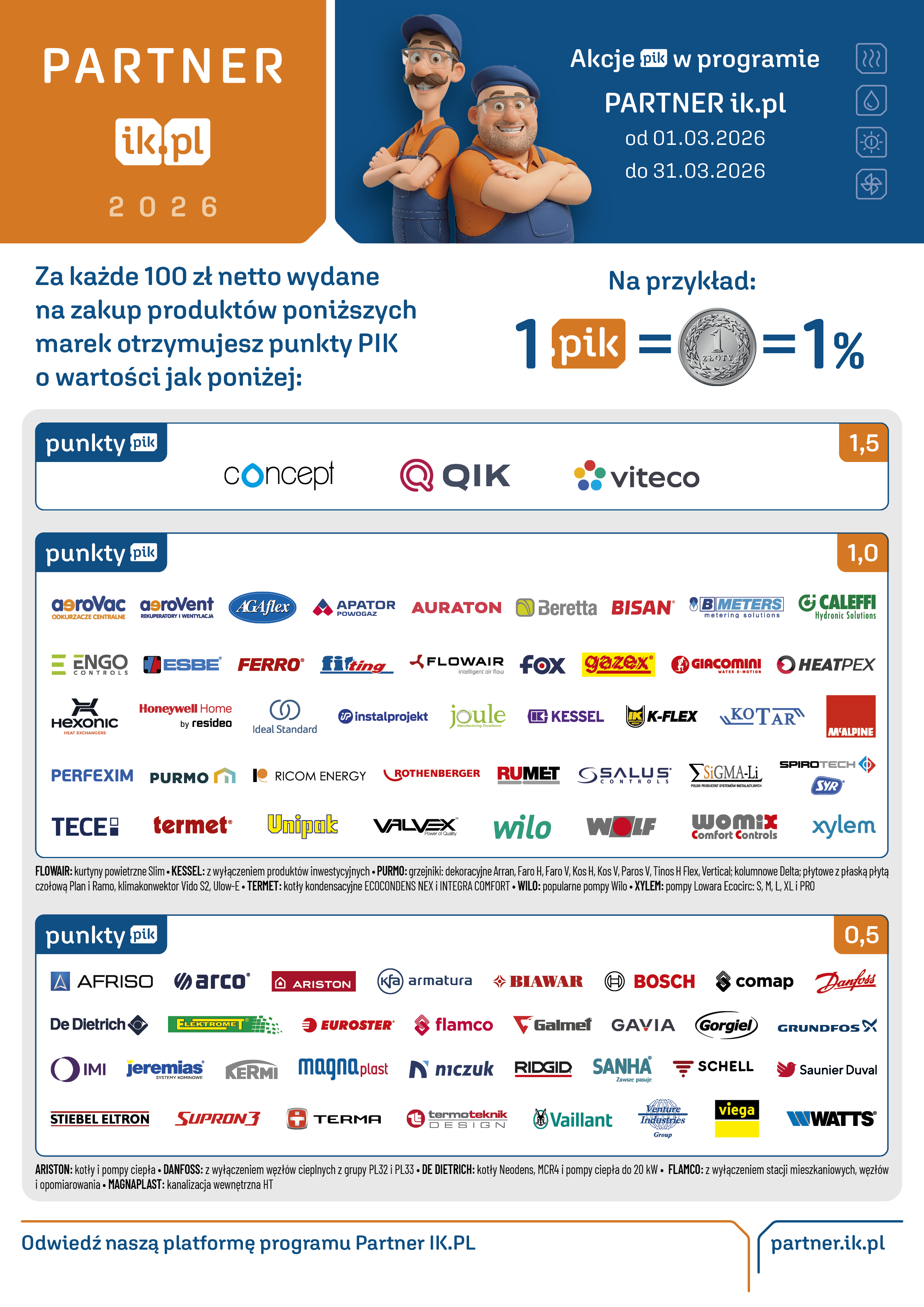 Najwięcej punktów otrzymasz przy zakupach produktów Marek Własnych Instal-Konsorcjum: Concept, QIK i Viteco, gdzie obowiązuje przelicznik 1,5 PIK za każde 100 zł netto. Pozostałe produkty naliczane są według listy akcji dostępnej poniżej.