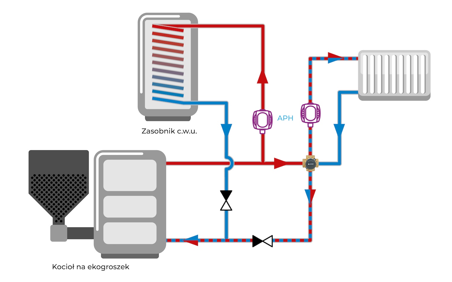 Miesza w odpowiednich proporcjach strumienie czynnika wypływającego na instalację i powracającego do kotła, w celu uzyskania odpowiedniej temperatury, chroniąc kocioł przed korozją niskotemperaturową.