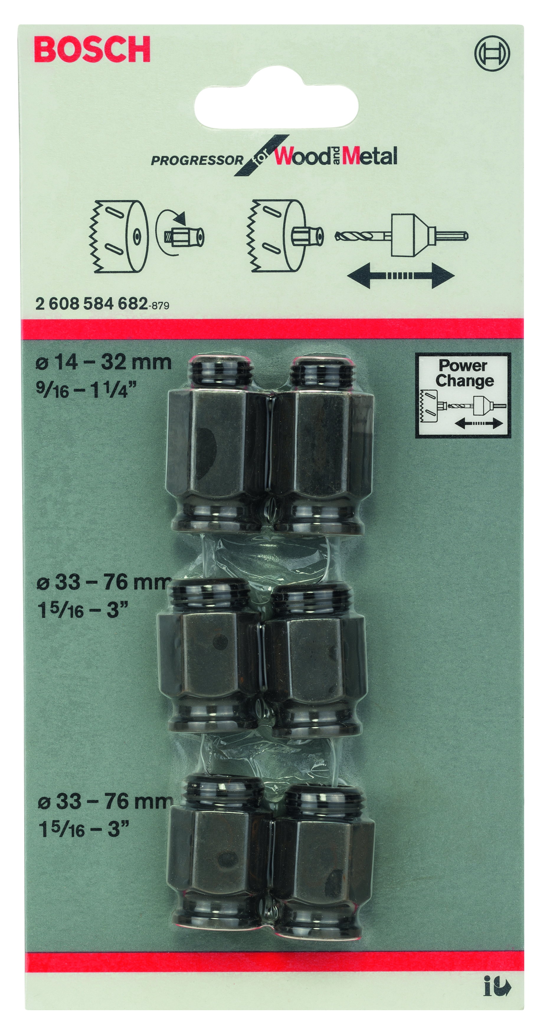6-częściowy zestaw adapterów do otwornic standardowych konkurencyjnych marek (np. Starrett, Baco, Lenox itp.) z 2 adapterami do Ø 14-30 mm (gwint 1/2" 20 UNF), 4 adaptery do Ø 32-210 mm (gwint 5/8" 18 UNF)