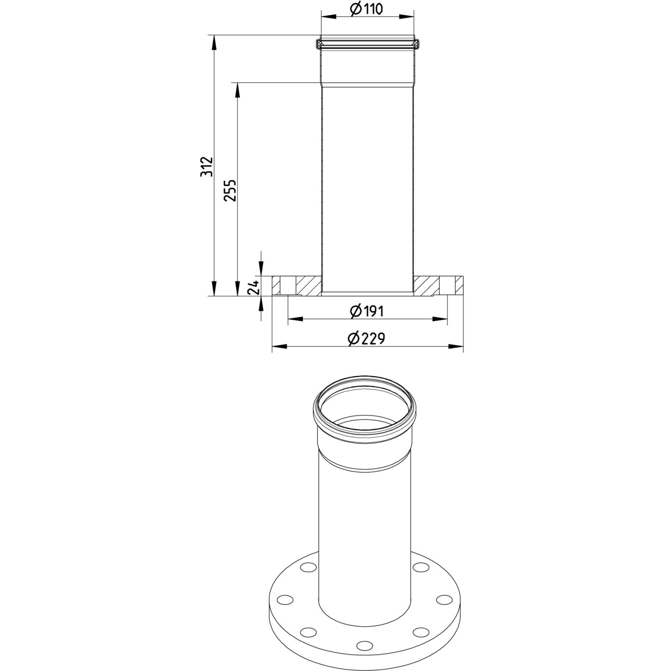 Adapter, rura z kielichem i kołnierzem, DN =110mm, stal kwasoodporna