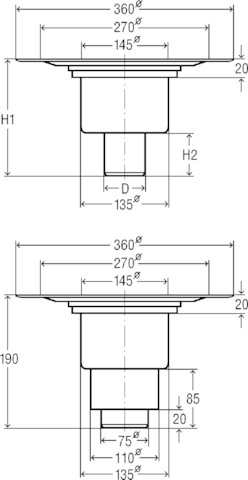 Advantix-korpus odpływu podłogowego nie występuje: nasadka, nr wzoru 4951.15 DN: 70 d: 75 H1: 175 H2: 65 wydajność odpływu przy wysokości spiętrzenia 10 mm: 0.7 wydajność odpływu przy wysokości spiętrzenia 20 mm: 1.6 odpływ pionowy