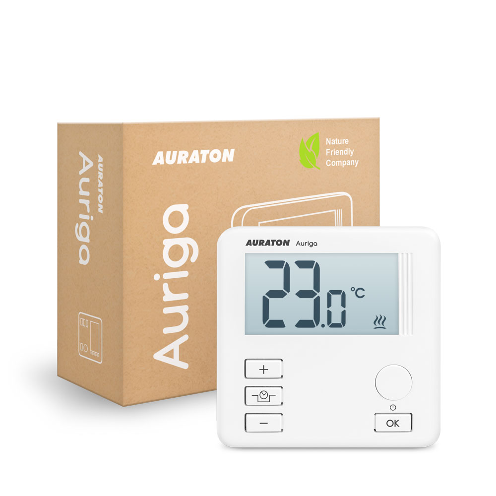 AURATON Auriga to dobowy, przewodowy regulator temperatury przeznaczony do współpracy z gazowym lub elektrycznym urządzeniem grzewczym. Na przedniej części obudowy znajdują się podświetlany wyświetlacz LCD oraz cztery przyciski funkcyjne.
