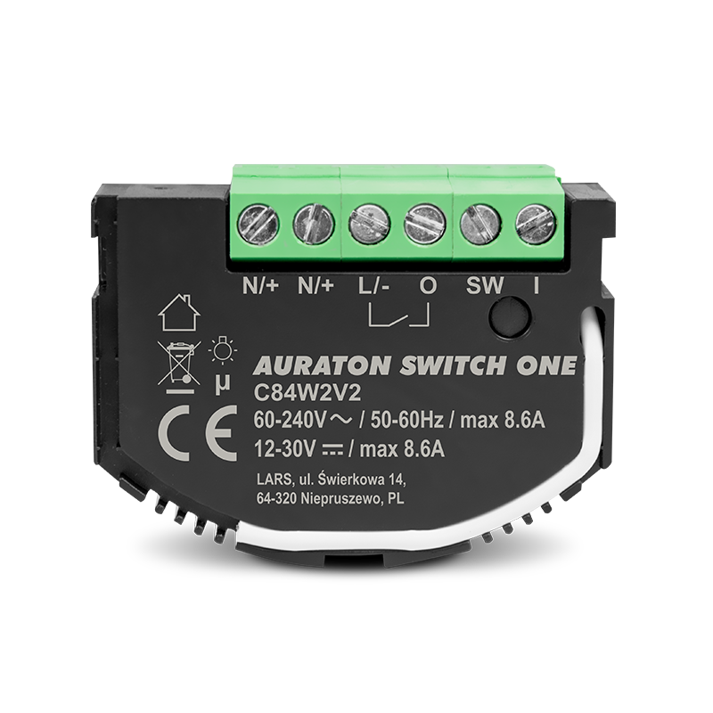 AURATON Switch ONE służy do sterowania urządzeniem elektrycznym za pomocą przycisku podłączonego do wejścia SW oraz I lub zdalnie. Urządzenie obsługuje zarówno łączniki bistabilne jak i monostabilne (dzwonkowe), przy czym nie są wymagane żadne dodatkowe ustawienia. Zmiana stanu łącznika powoduje załączenie lub odcięcie napięcia na wyjściu O. Urządzenie umożliwia pomiar napięcia w sieci zasilającej oraz pomiar parametrów odbiornika takich jak: moc czynna i całkowite zużycie energii. Urządzenie wyposażono w diodę sygnalizującą aktualny stan pracy oraz przycisk pozwalający na dodawanie lub usuwanie urządzenia z systemu AURATON Smart. Moduł AURATON Switch ONE jest przeznaczony tylko do użytku wewnętrznego, do montażu w puszkach instalacyjnych.