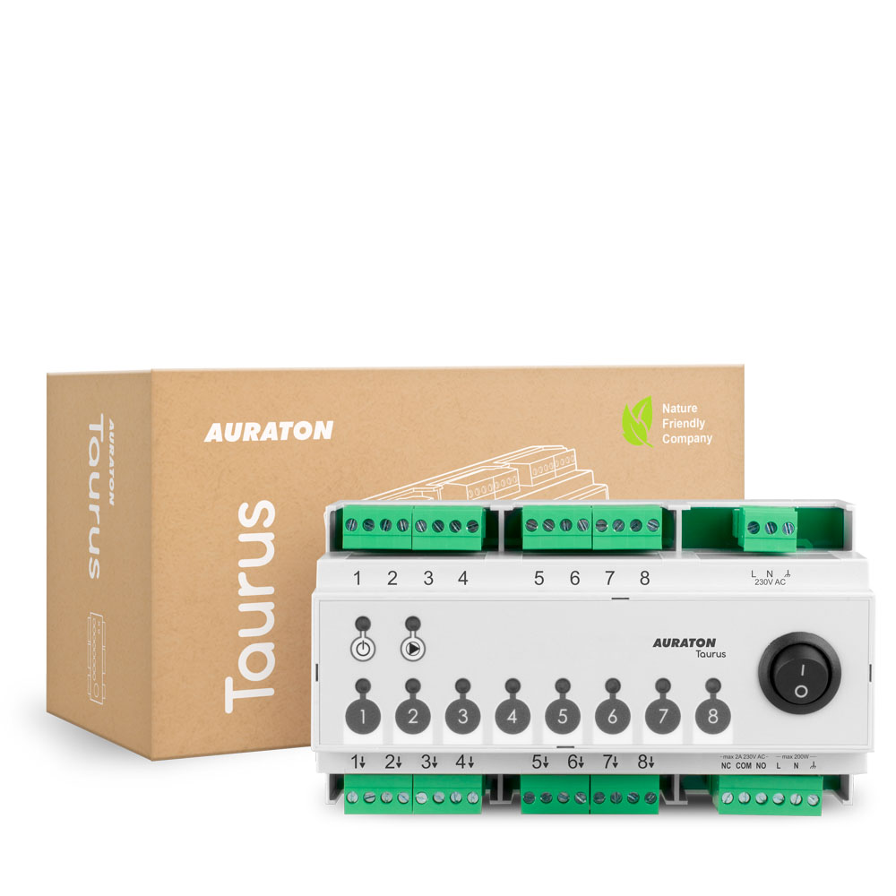AURATON Taurus to 8-strefowa, przewodowa listwa przeznaczona do współpracy z przewodowymi regulatorami temperatury z wyjściem beznapięciowym (COM-NO), siłownikami, pompą C.O. oraz urządzeniem grzewczym.