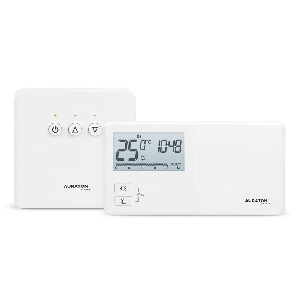AURATON Tucana SET to zestaw tygodniowego, bezprzewodowego regulatora temperatury ze sterownikiem urządzenia grzewczego AURATON Fornax, przeznaczony do współpracy z gazowym lub elektrycznym urządzeniem grzewczym.