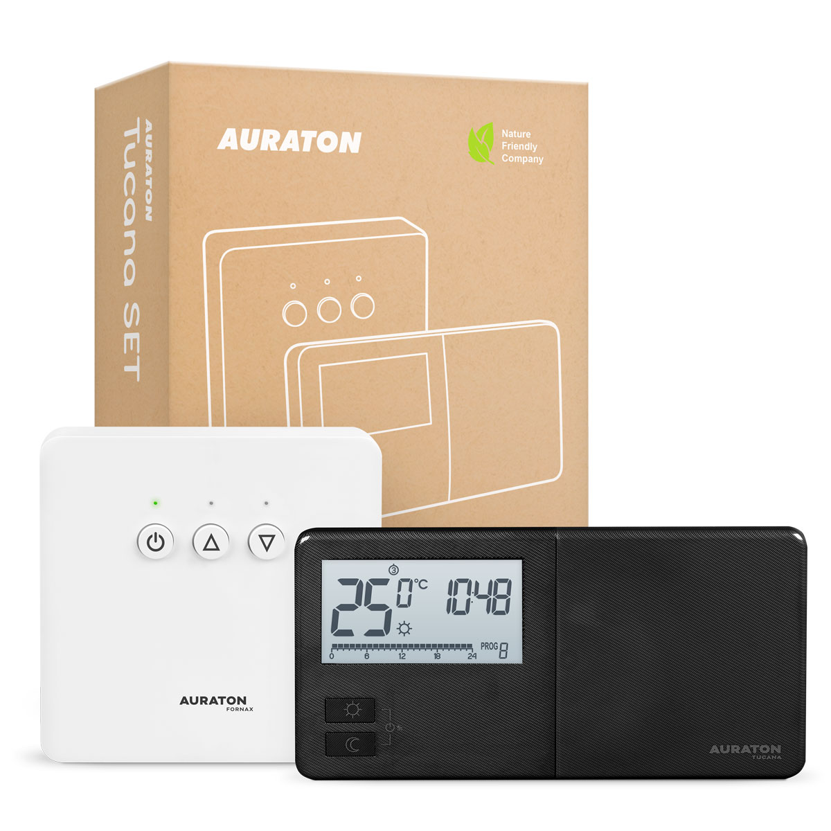 AURATON Tucana SET to zestaw tygodniowego, bezprzewodowego regulatora temperatury ze sterownikiem urządzenia grzewczego AURATON Fornax, przeznaczony do współpracy z gazowym lub elektrycznym urządzeniem grzewczym.