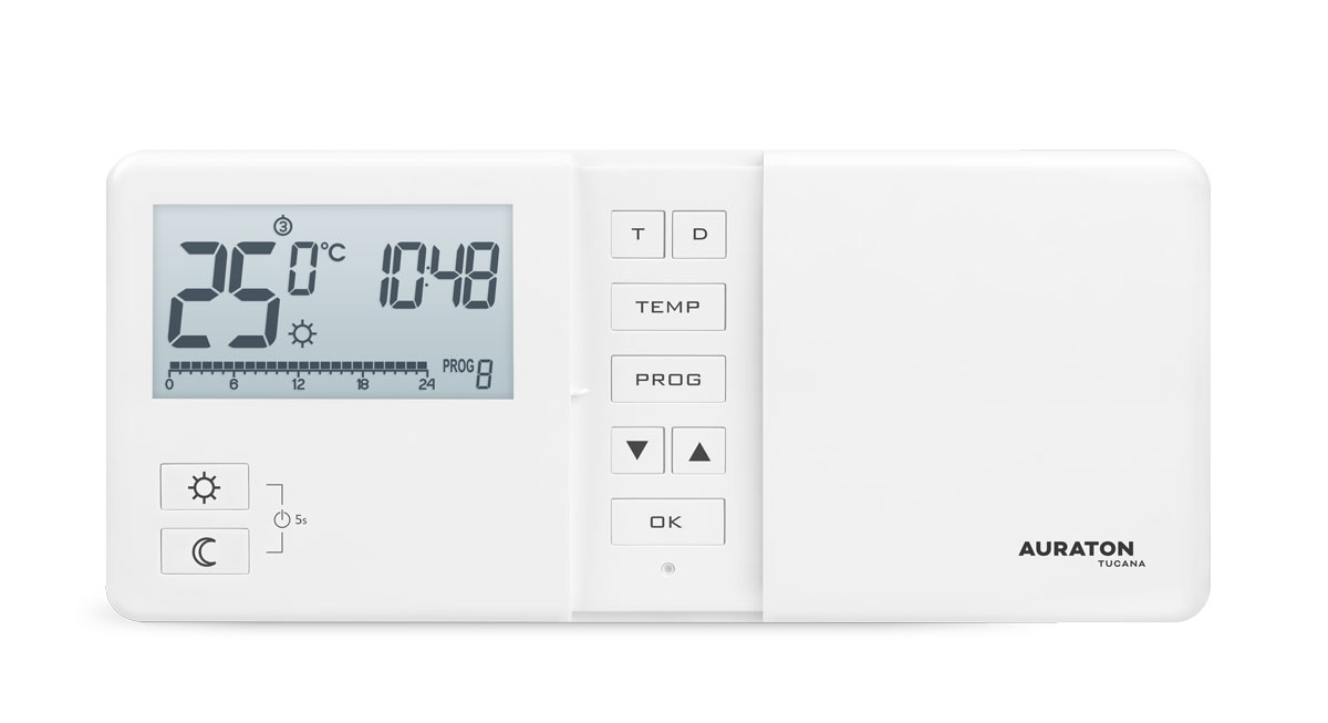 AURATON Tucana to tygodniowy, przewodowy regulator temperatury, przeznaczony do współpracy z gazowym lub elektrycznym urządzeniem grzewczym.
