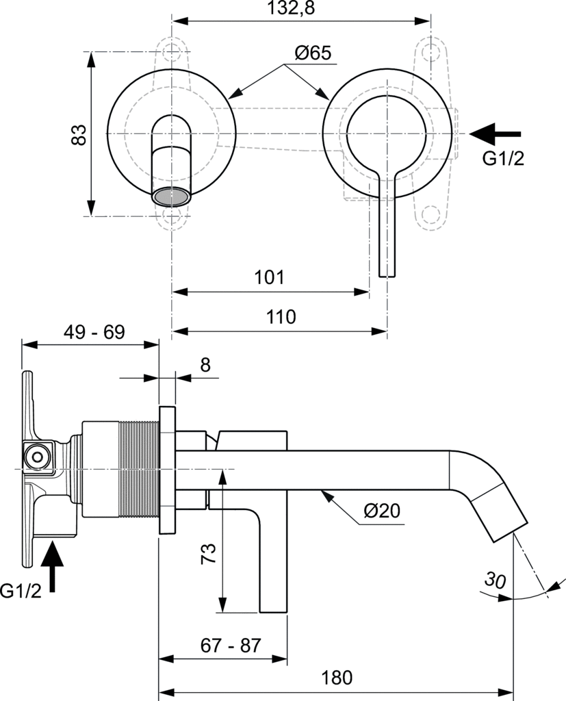 Zestaw montażowy podtynkowej baterii umywalkowej. Głowica ceramiczna 28 mm z ogranicznikiem temperatury wody. Bez funkcji Click. Wylewka rurowa o długości 180 mm. Okrągła, metalowa rozeta z logo Ideal Standard. Metalowy uchwyt z logo Ideal Standard bez oznaczeń. Aerator typu Caché M16,5x1 z ogranicznikiem przepływu wody do 5 l/min. Do skompletowania z elementem montażowym A1313NU.