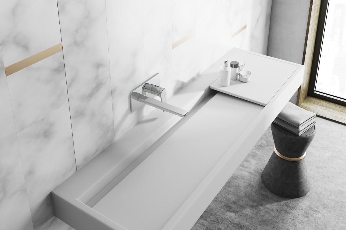 Bateria umywalkowa podtynkowa o subtelnym prostokątnym dizajnie. Świetnie wpisuje się do nowoczesnych aranżacji. Zawiera w komplecie zestaw elementów wewnętrznych i natynkowych.