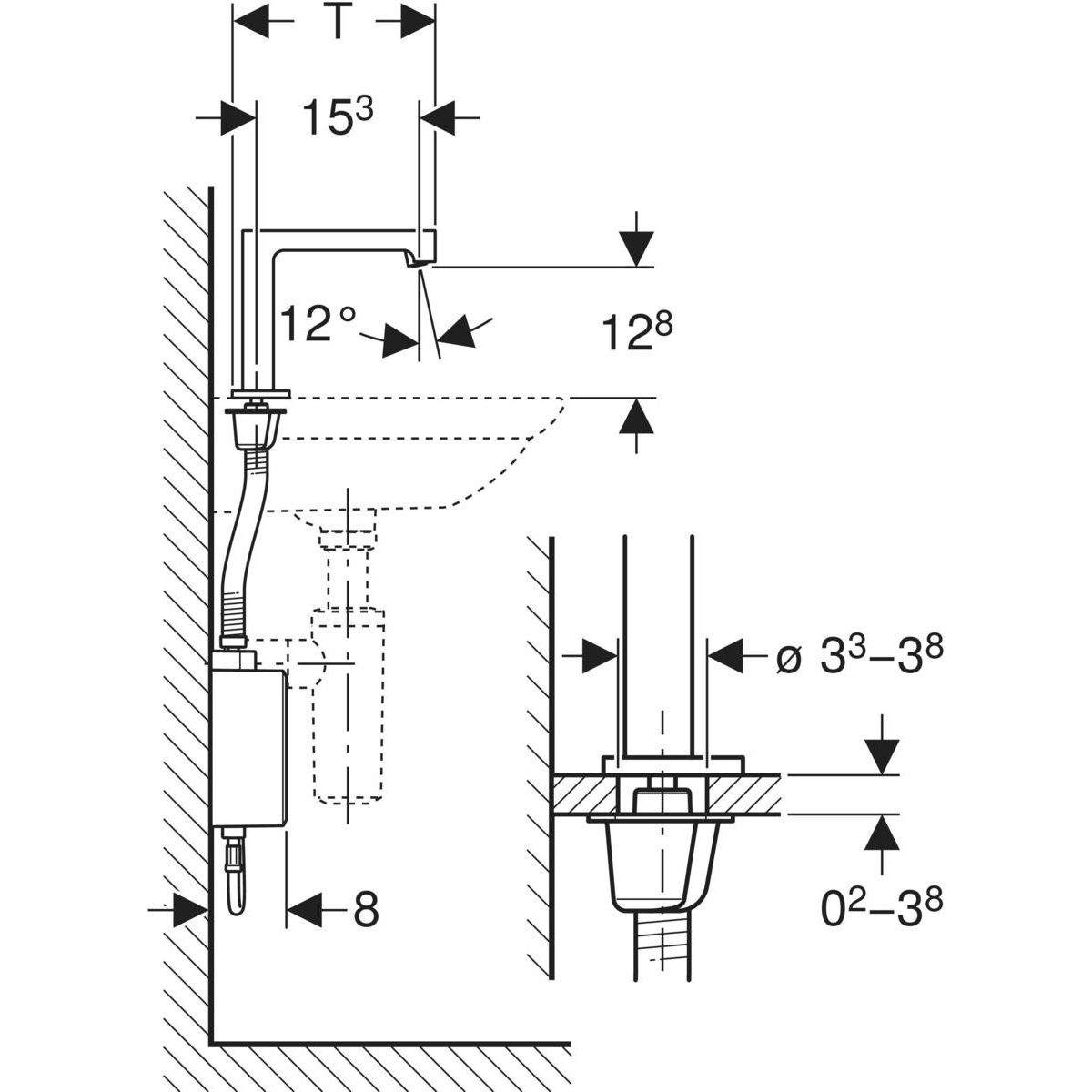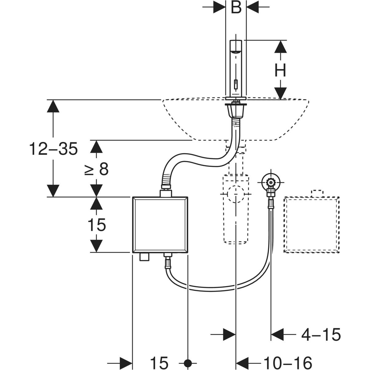 Poziom hałasu armatury Grupa I, zgodnie z DIN 4109 Automatyczne uruchamianie spłukiwania Wykrywanie za pomocą podczerwieni Czujnik podczerwieni z funkcją samoregulacji Wandalooporny Ograniczanie strumienia za pomocą regulatora strumienia Regulacja temperatury poprzez mieszacz (tylko w przypadku modelu z mieszaczem lub mieszaczem termostatycznym) Brak możliwości regulacji samej ciepłej lub samej zimnej wody (tylko w przypadku modelu z mieszaczem lub mieszaczem termostatycznym) Termostat wg EN 1111 (tylko w przypadku modeli z mieszaczem termostatycznym) Ochrona przed poparzeniem dzięki ograniczeniu temperatury wody do 42°C (tylko w przypadku modeli z mieszaczem termostatycznym) Możliwość termicznej dezynfekcji wg DVGW W 551 Zasilanie bateryjne Bateria wystarczająca na ok. 200'000 uruchomień Ostrzeżenie o słabej baterii Możliwość regulacji trybu oszczędzania energii Oszczędność wody dzięki precyzyjnej dwupromieniowej technice wykrywania użytkownika Możliwość zmiany ustawień oraz odczytu statystyk za pomocą pilota serwisowego Geberit Service-Handy Ustawienia i obsługa urządzenia za pomocą urządzenia mobilnego przez zintegrowany interfejs Bluetooth® Kompatybilny z aplikacją Geberit Control Możliwość regulacji programu z funkcją oszczędzającą wodę Możliwość regulacji programu spłukiwania okresowego Możliwość indywidualnej regulacji czasu trwania spłukiwania Możliwość wyłączenia uruchamiania spłukiwania Ze zintegrowanym zaworem zwrotnym Jednostka funkcjonalna z wbudowanym filtrem koszyczkowym Do zastosowania w obiektach publicznych i pół-publicznych Do montażu w umywalce lub blacie pod umywalkę Do podłączania zimnej i ciepłej wody (tylko w przypadku modelu z mieszaczem lub mieszaczem termostatycznym) Do podłączania zimnej lub zmieszanej wody (tylko w modelach bez mieszacza) Do zastosowania również z umywalkami ze stali nierdzewnej Model bez mieszacza nadaje się do połączenia z podgrzewaczem, patrz arkusz danych technicznych „Baterie umywalkowe z podgrzewaczami”