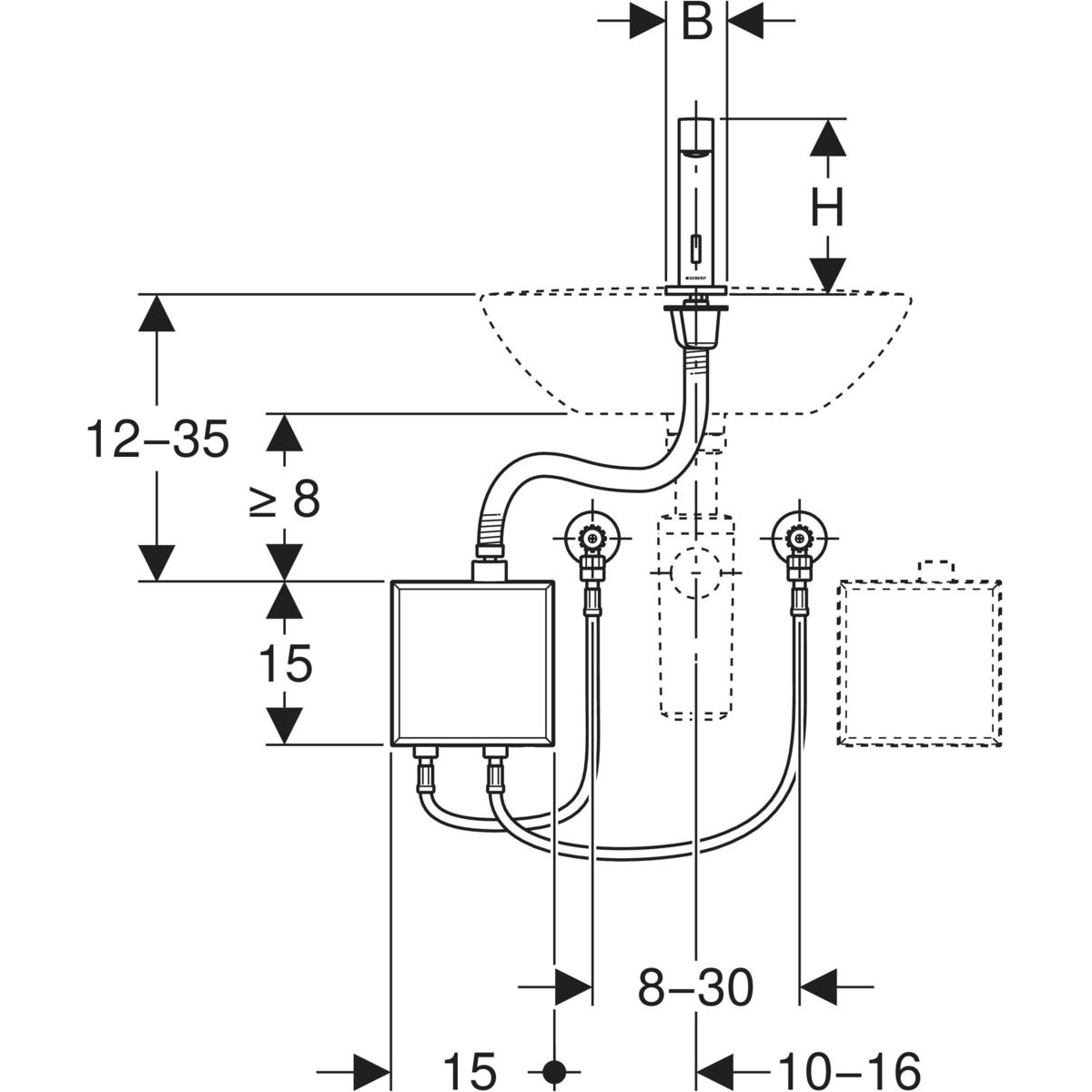 Poziom hałasu armatury Grupa I, zgodnie z DIN 4109 Automatyczne uruchamianie spłukiwania Wykrywanie za pomocą podczerwieni Czujnik podczerwieni z funkcją samoregulacji Wandalooporny Ograniczanie strumienia za pomocą regulatora strumienia Regulacja temperatury poprzez mieszacz (tylko w przypadku modelu z mieszaczem lub mieszaczem termostatycznym) Brak możliwości regulacji samej ciepłej lub samej zimnej wody (tylko w przypadku modelu z mieszaczem lub mieszaczem termostatycznym) Termostat wg EN 1111 (tylko w przypadku modeli z mieszaczem termostatycznym) Ochrona przed poparzeniem dzięki ograniczeniu temperatury wody do 42°C (tylko w przypadku modeli z mieszaczem termostatycznym) Możliwość termicznej dezynfekcji wg DVGW W 551 Zasilanie bateryjne Bateria wystarczająca na ok. 200'000 uruchomień Ostrzeżenie o słabej baterii Możliwość regulacji trybu oszczędzania energii Oszczędność wody dzięki precyzyjnej dwupromieniowej technice wykrywania użytkownika Możliwość zmiany ustawień oraz odczytu statystyk za pomocą pilota serwisowego Geberit Service-Handy Ustawienia i obsługa urządzenia za pomocą urządzenia mobilnego przez zintegrowany interfejs Bluetooth® Kompatybilny z aplikacją Geberit Control Możliwość regulacji programu z funkcją oszczędzającą wodę Możliwość regulacji programu spłukiwania okresowego Możliwość indywidualnej regulacji czasu trwania spłukiwania Możliwość wyłączenia uruchamiania spłukiwania Ze zintegrowanym zaworem zwrotnym Jednostka funkcjonalna z wbudowanym filtrem koszyczkowym Do zastosowania w obiektach publicznych i pół-publicznych Do montażu w umywalce lub blacie pod umywalkę Do podłączania zimnej i ciepłej wody (tylko w przypadku modelu z mieszaczem lub mieszaczem termostatycznym) Do podłączania zimnej lub zmieszanej wody (tylko w modelach bez mieszacza) Do zastosowania również z umywalkami ze stali nierdzewnej Model bez mieszacza nadaje się do połączenia z podgrzewaczem, patrz arkusz danych technicznych „Baterie umywalkowe z podgrzewaczami”