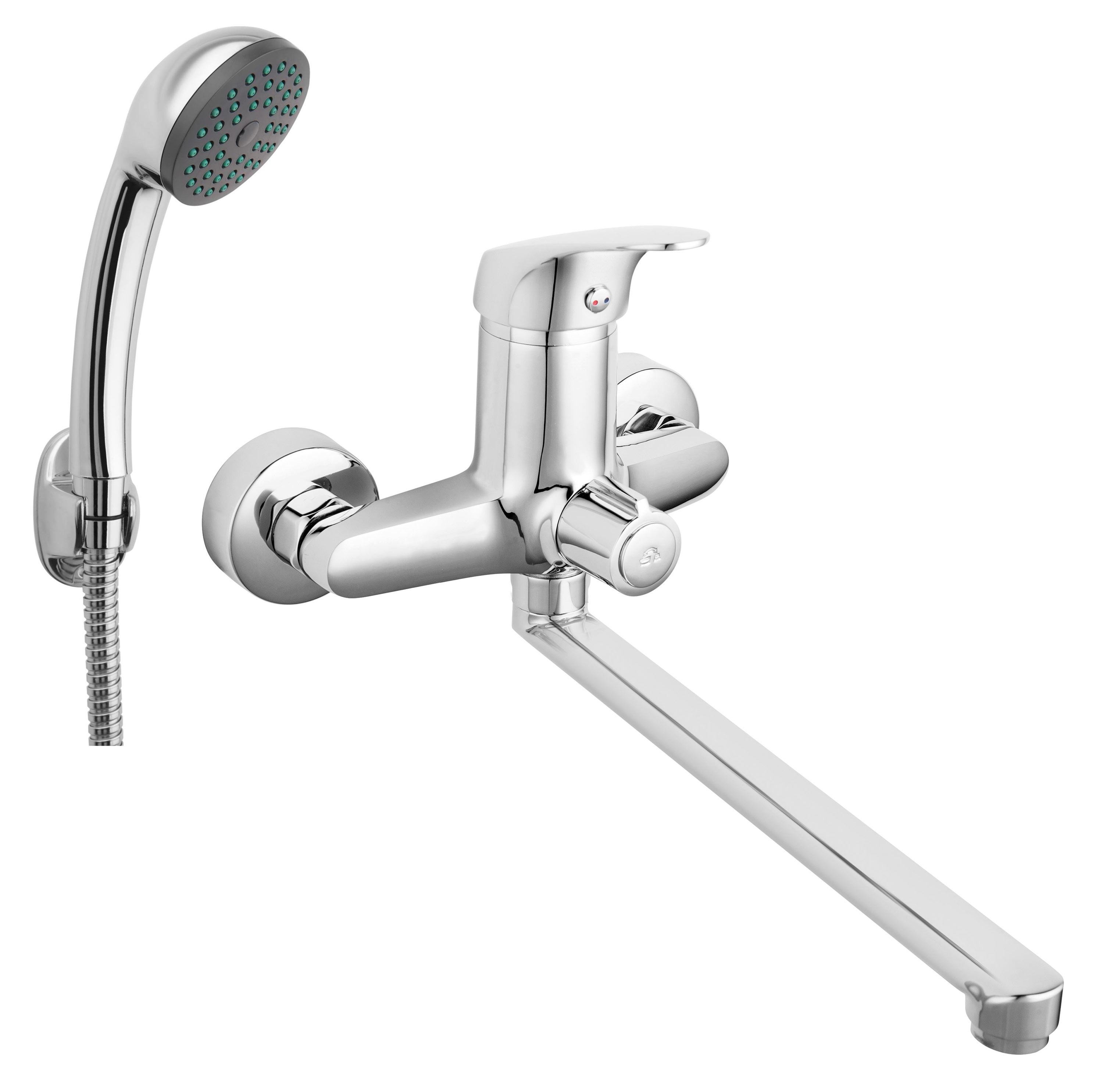 Bateria umywalkowo-wannowa z funkcjonalną, ruchomą wylewką, w zestawie z rączką natryskową z funkcją strumienia typu deszcz, uchwytem oraz wężem natryskowym. Ceramiczny, ergonomiczny przełącznik wylewka/natrysk zapewnia łatwość w obsłudze.