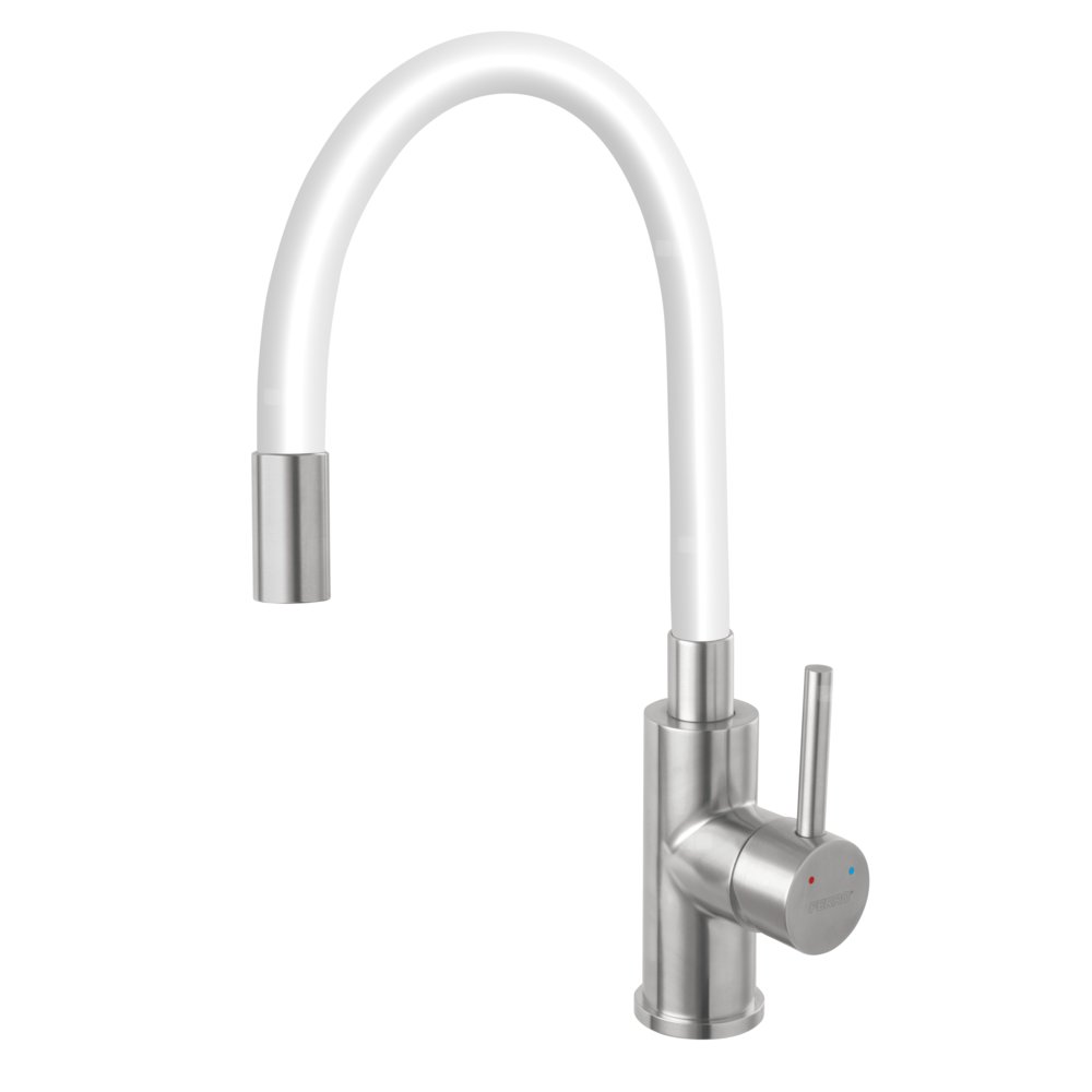 Bateria zlewozmywakowa FERRO ZUMBA INOX, kolor stal, elastyczna biała wylewka