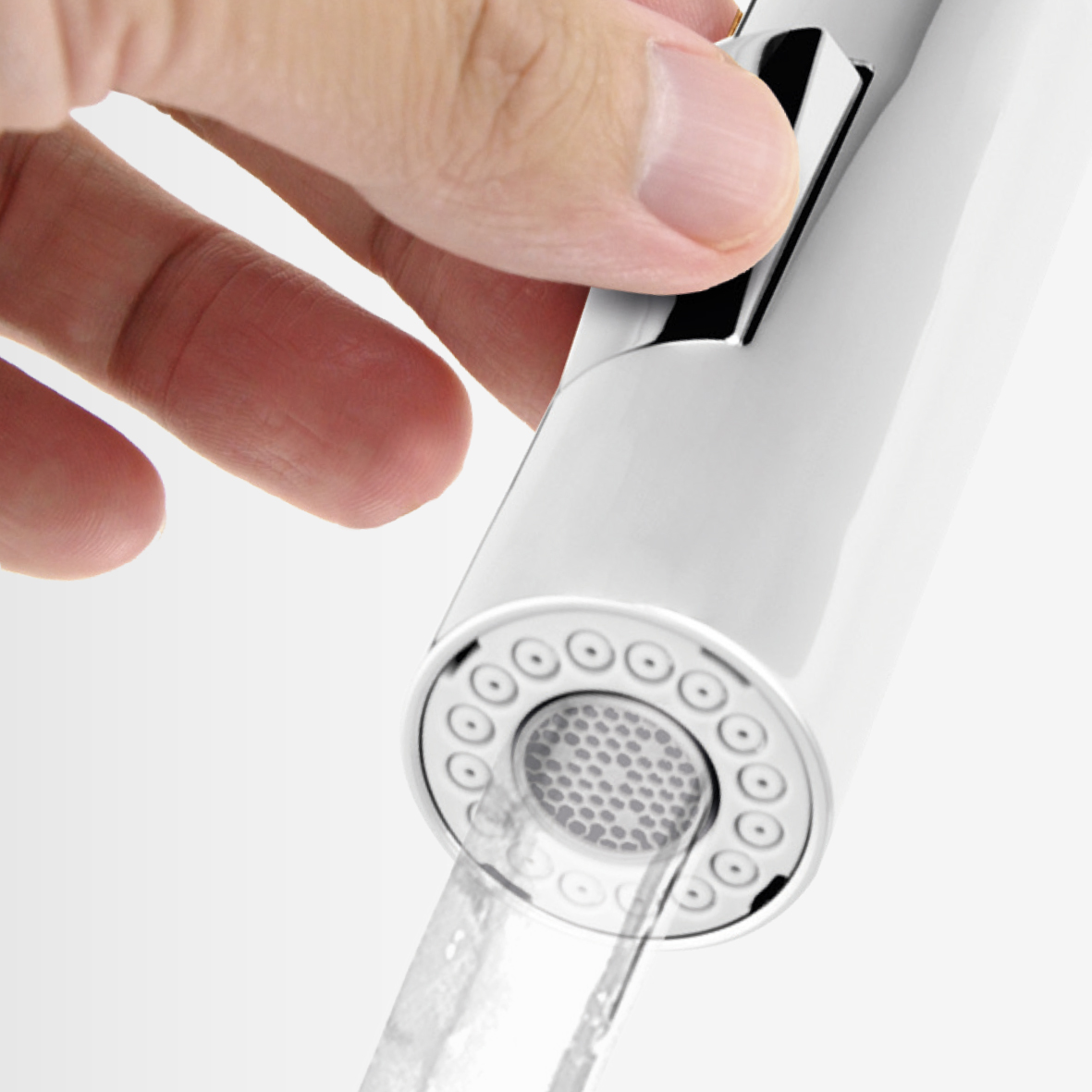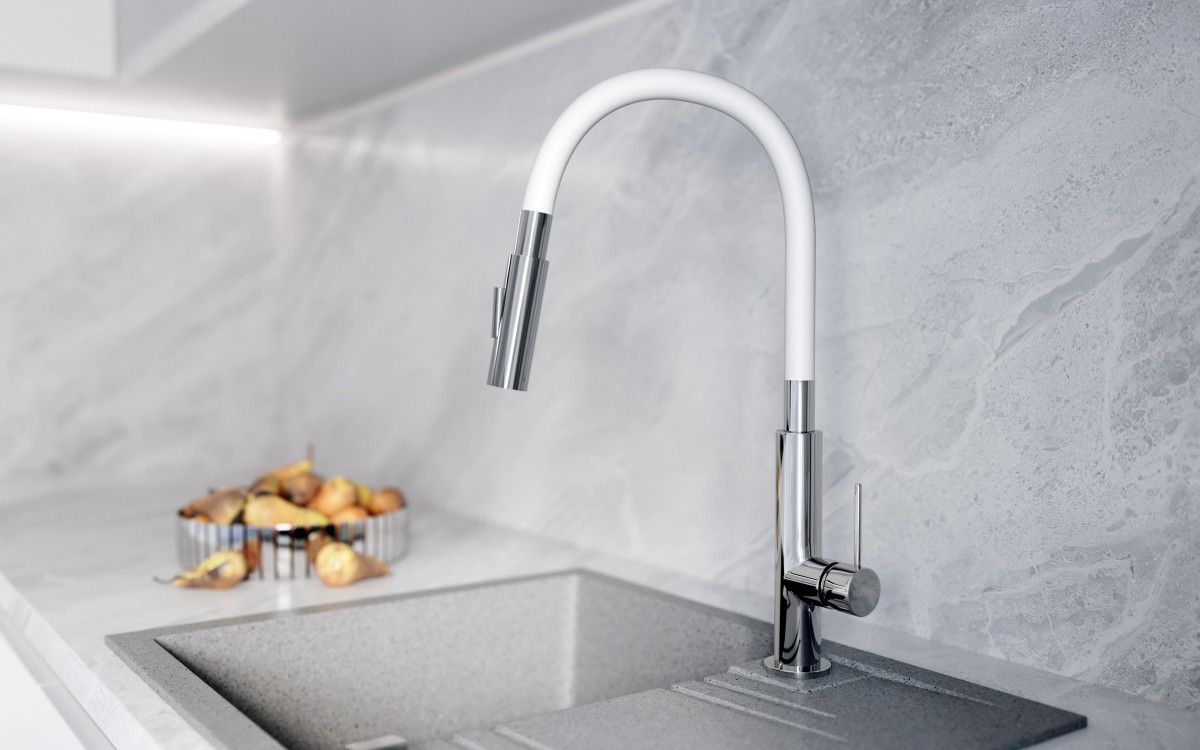 Bateria zlewozmywakowa o ciekawym, smukłym cylindrycznym kształcie. Posiada ruchomą, elastyczną wylewkę, której kształt możemy dowolnie formować. Dzięki temu rozwiązaniu bateria staję się bardziej praktyczna oraz łatwiejsza w użytkowaniu. Dwu-funkcyjna wylewka baterii daje nam również możliwość wyboru strumienia wody.