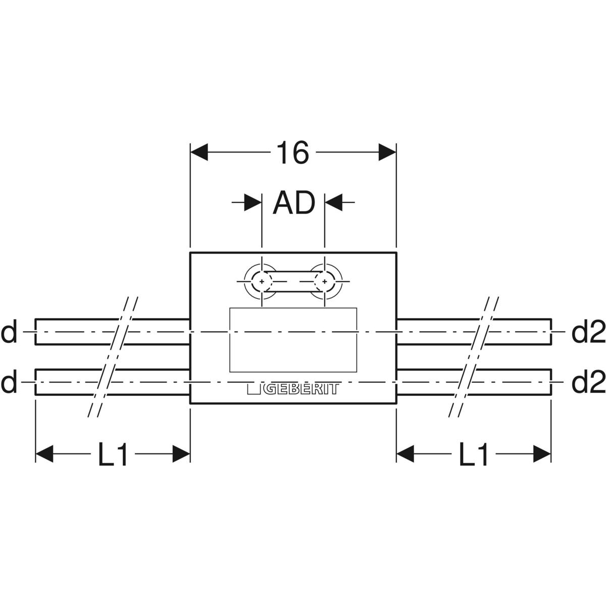 Blok montażowy typ T Geberit: Materiał=PE-RT II / Al / PE-RT II, d=20mm, d1=16mm, d2=20mm