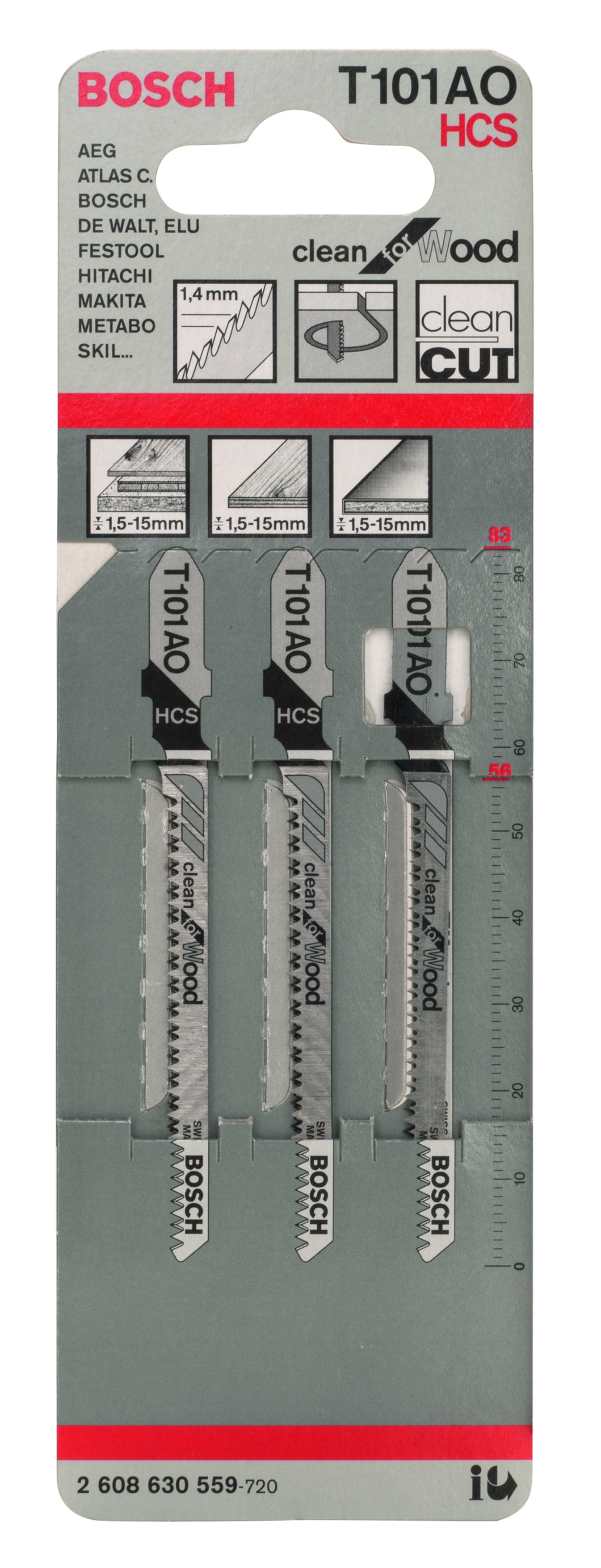 | Tekst produktu, osprzęt szary | T 101 AO HCS, z zębami szpiczastymi, bok i zęby szlifowane Miękkie drewno, sklejka, płyty powlekane (1,5-15 mm), szczególnie do cięć krzywoliniowych |