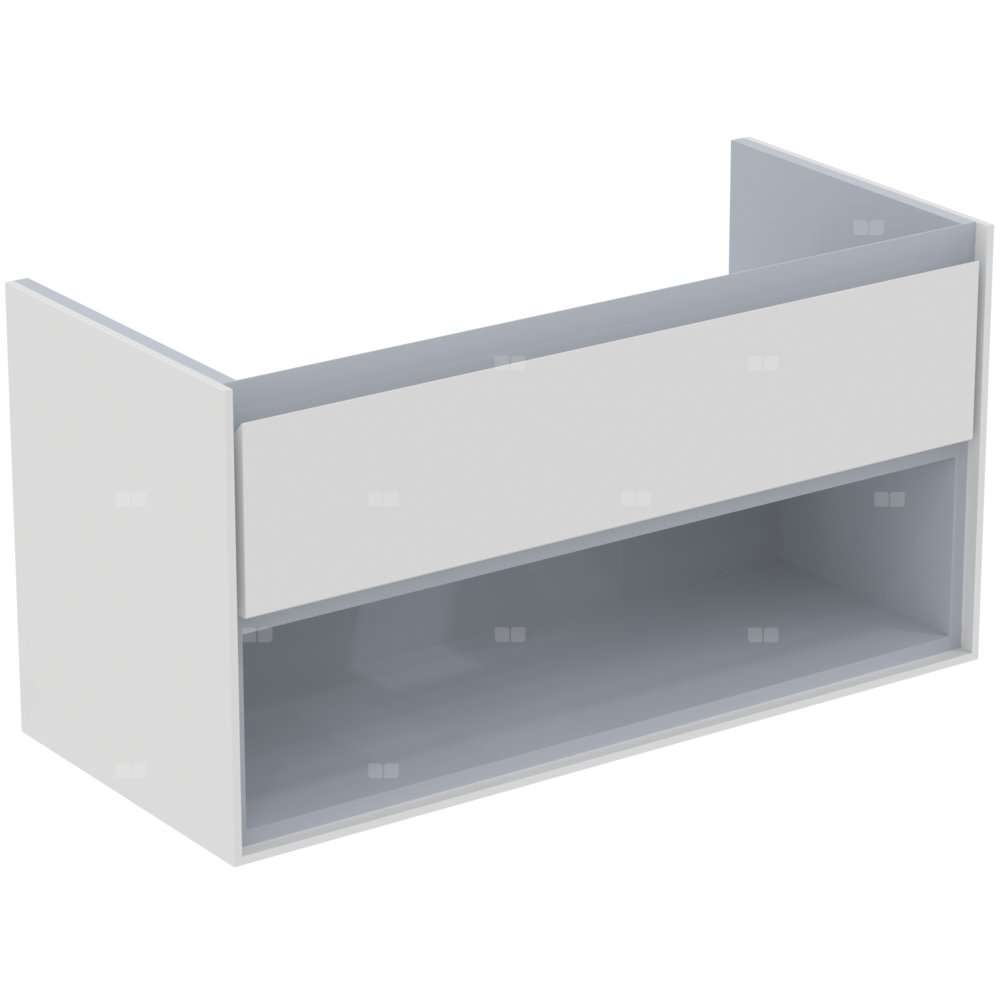 Wisząca 100 cm. 1 szuflada ze zintegrowanym uchwytem. Szuflady z systemem samodomykania. Otwarta dolna półka. Zestaw montażowy w komplecie. Szafka do skompletowania z: umywalką z powierzchniami bocznymi 104 cm E027401 lub. umywalką nablatową 60 cm E034801/40 cm E034701 z wymaganym blatem E0851. Zalecany: syfon oszczędzający przestrzeń EE23033967 (zamawiany oddzielnie).