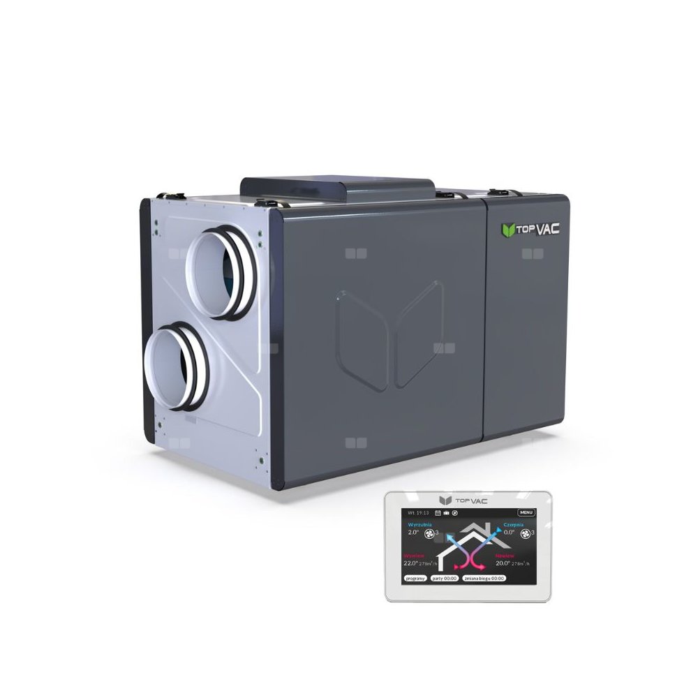 Centrala wentylacyjna TopVac 650HCF ze sterownikiem, 650 m3/h, odzysk ciepła, króćce DN200 na boki
