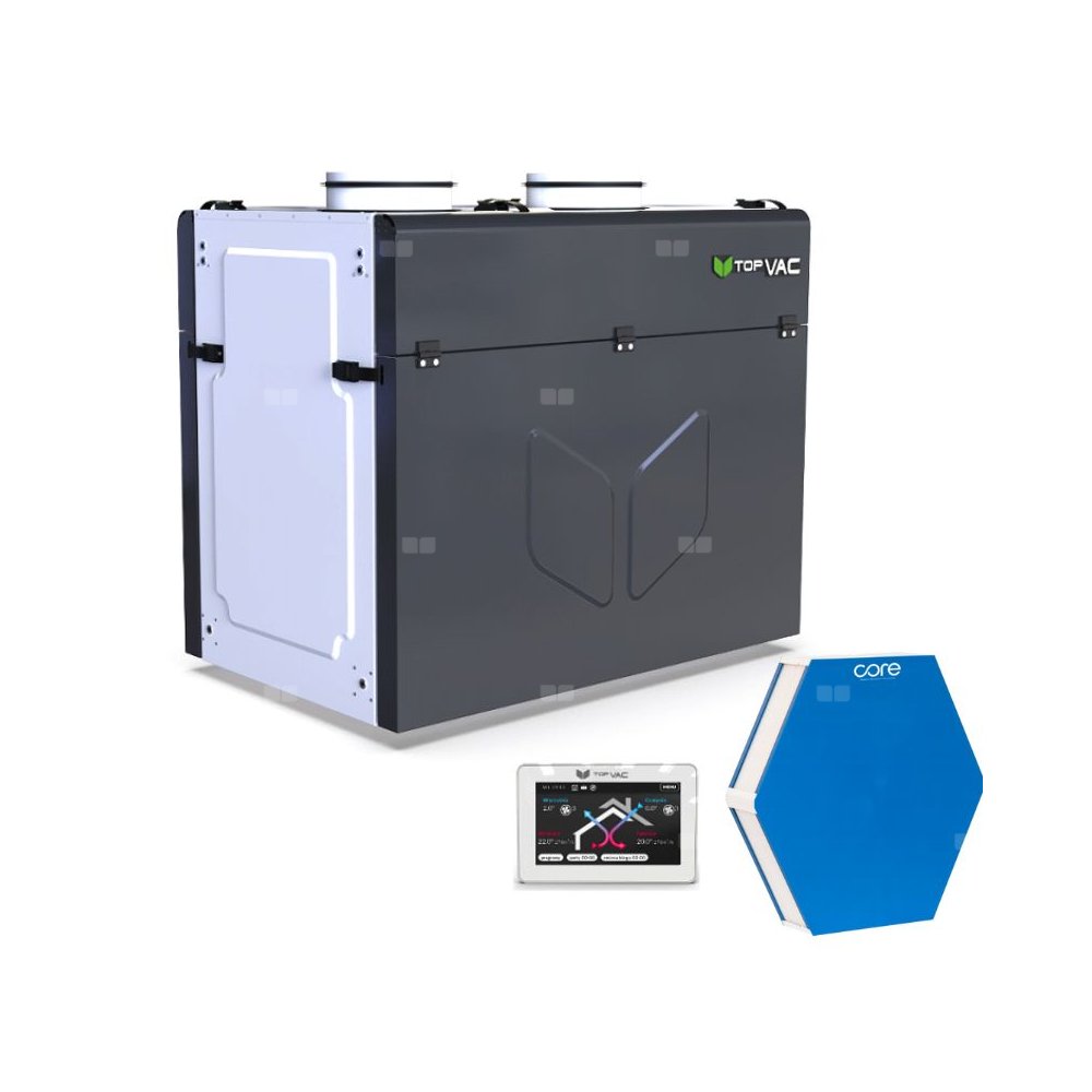 Centrala wentylacyjna TopVac 650VCFENT ze sterownikiem, 650 m3/h, odzysk ciepła i wilgoci z wymiennikiem entalpicznym, króćce DN200 do góry