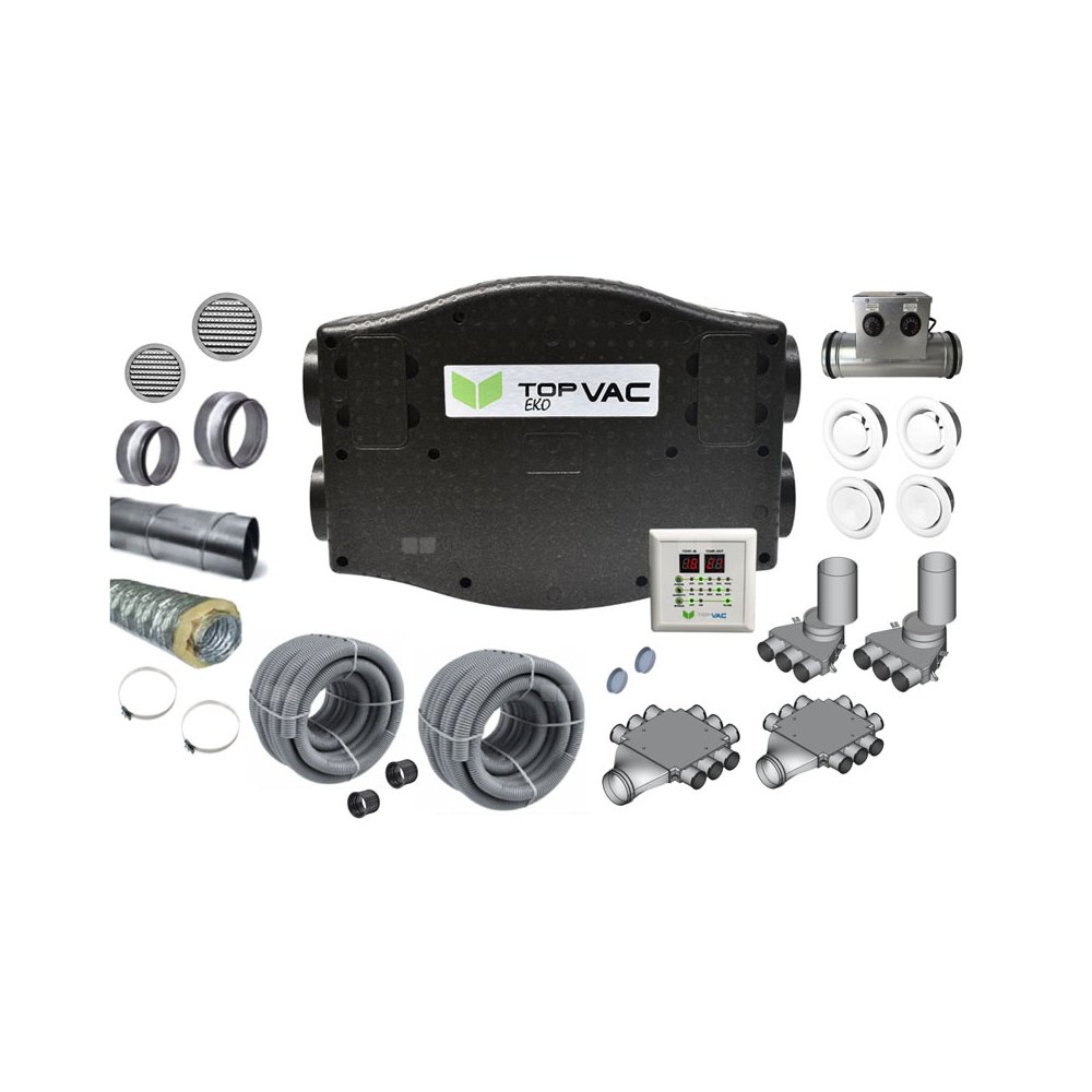 Centrala wentylacyjna TopVac Eko 260GV ze sterownikiem i higrostatem, nagrzewnicą zewnętrzną oraz zestawem instalacyjnym (Pakiet)