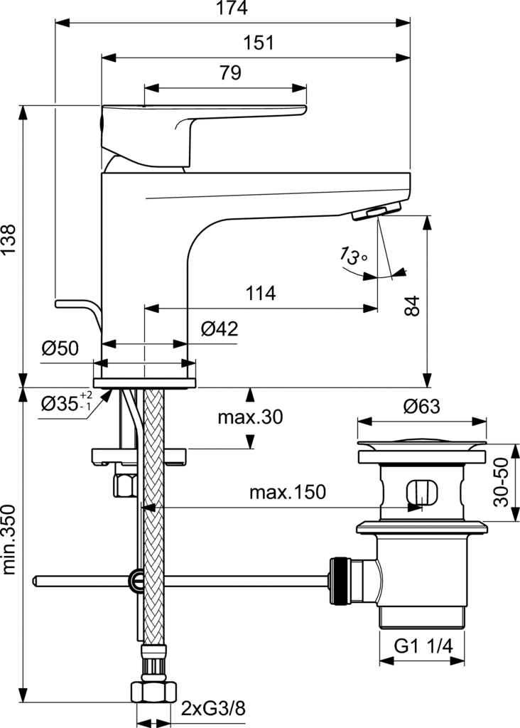 Głowica ceramiczna 28 mm z ogranicznikiem temperatury wody. Metalowy uchwyt z oznaczeniem wody ciepłej i zimnej. Aerator typu Perlator z ogranicznikiem przepływu wody do 5 l/min. Wysokość od przepływ wodyu wody do podstawy baterii H80. System montażu EASY-FIX. Wężyki przyłączeniowe G3/8". Metalowy korek automatyczny. Zgodność z EN817.