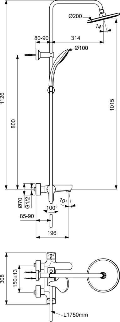 System natryskowy z baterią jednouchwytową i ze zintegrowanym przełącznikiem. Korpus baterii: wanna/prysznic. Innowacyjna głowica ceramiczna FirmaFlow 38 mm z ogranicznikiem temperatury. Mocowanie z nakrętkami maskującymi. Ukryte wyciszone przyłącza mimośrodowe. Metalowy uchwyt z nadrukowanymi czerwonymi i niebieskimi oznaczeniami. Zawór zwrotny. Zintegrowany przełącznik słuchawka/deszczownica/wanna, 40 mm,. obrót: 360°. Deszczownica z tworzywa, Ø 200 mm, z ogranicznikiem przepływu wody do 9,6 l/min. Jednofunkcyjna słuchawka prysznicowa, Ø 100 mm z ogranicznikiem przepływu wody do 8 l/min. Wąż prysznicowy, 1750 mm. Wysokość całkowita: 1126 mm.