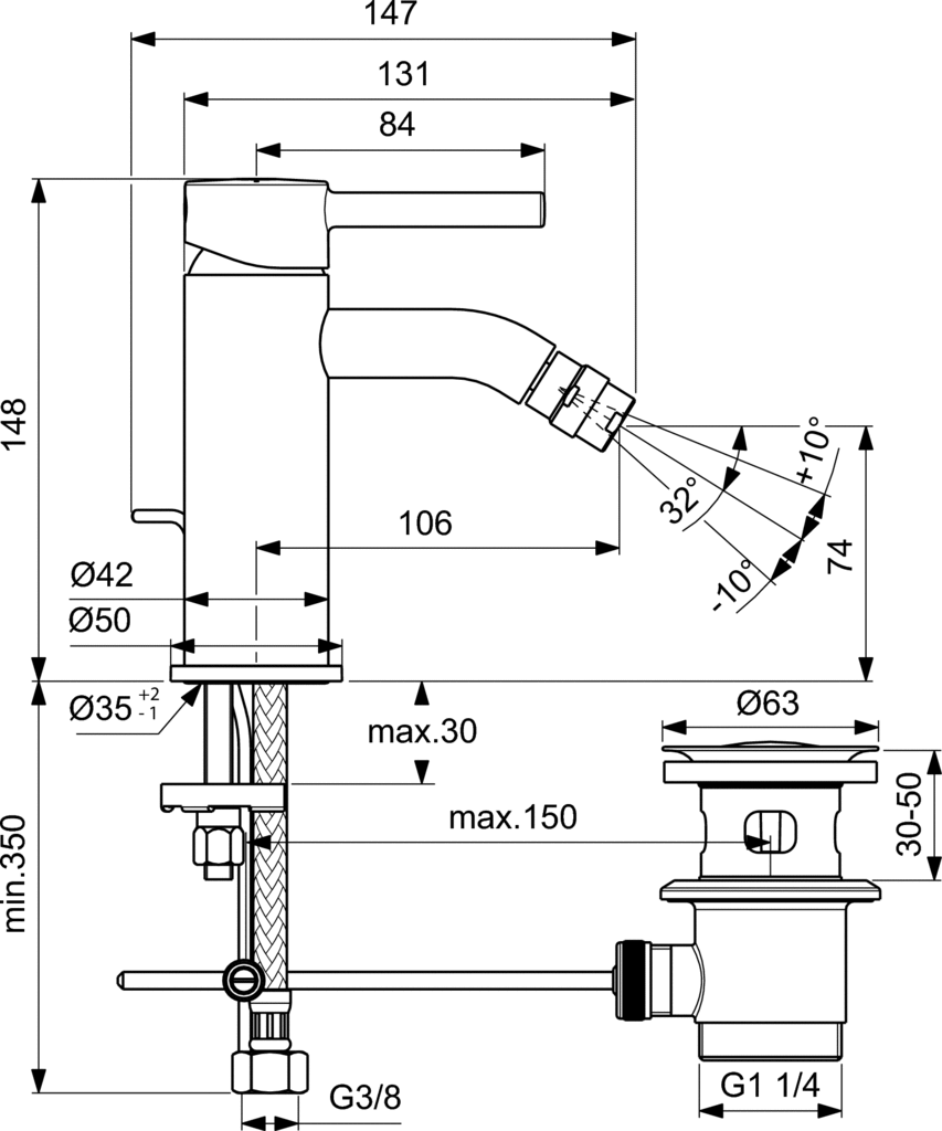 Jednootworowa bateria bidetowa. Głowica ceramiczna 35 mm z ogranicznikiem temp. wody. Metalowy uchwyt z oznaczeniem wody ciepłej i zimnej. Aerator Ball-joint M18x1 - z ogranicznikiem przepływu wody do 5l/min. Wężyki przyłączeniowe PEX G3/8". Metalowy korek automatyczny. System montażu EASY-FIX. Zgodna z EN817.