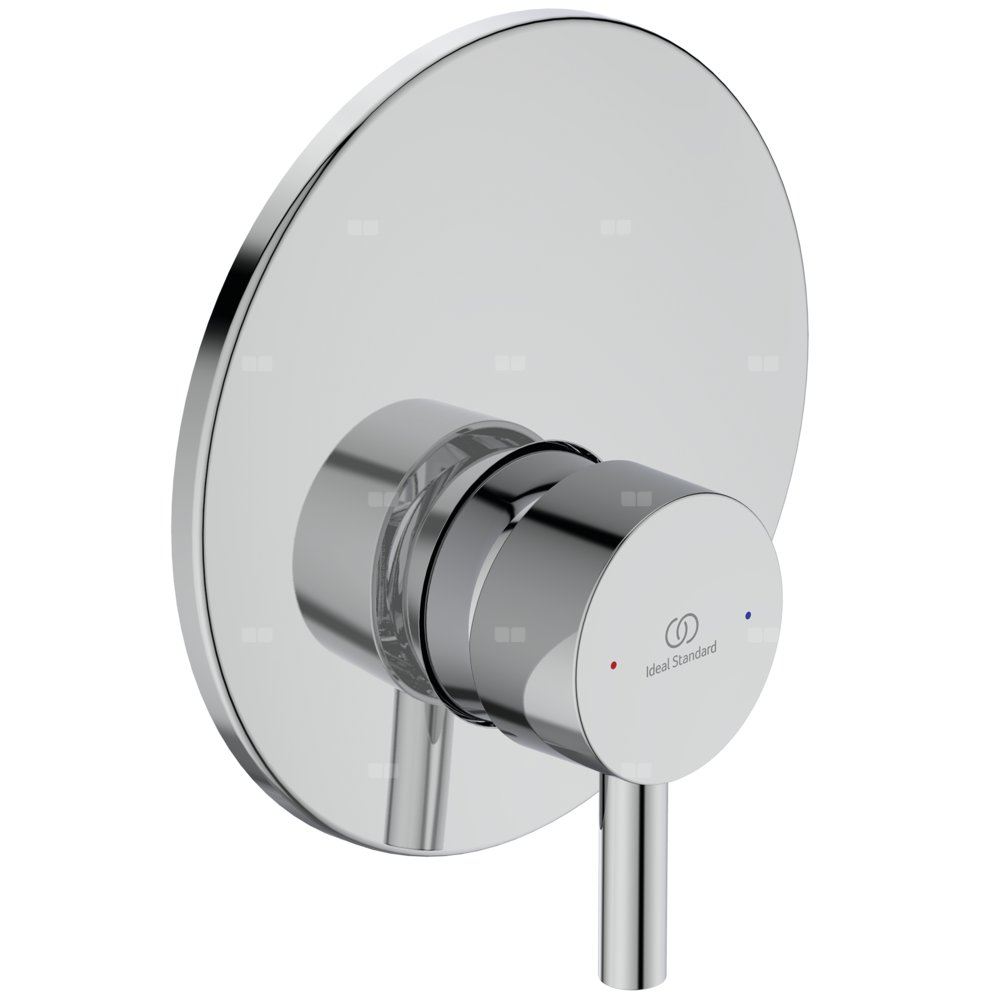 Zestaw montażowy podtynkowej baterii natryskowej Ceraline. Głowica Click 47 mm. Metalowy uchwyt z nadrukowanymi czerwonymi i niebieskimi oznaczeniami, chromowana rozeta z tworzywa.