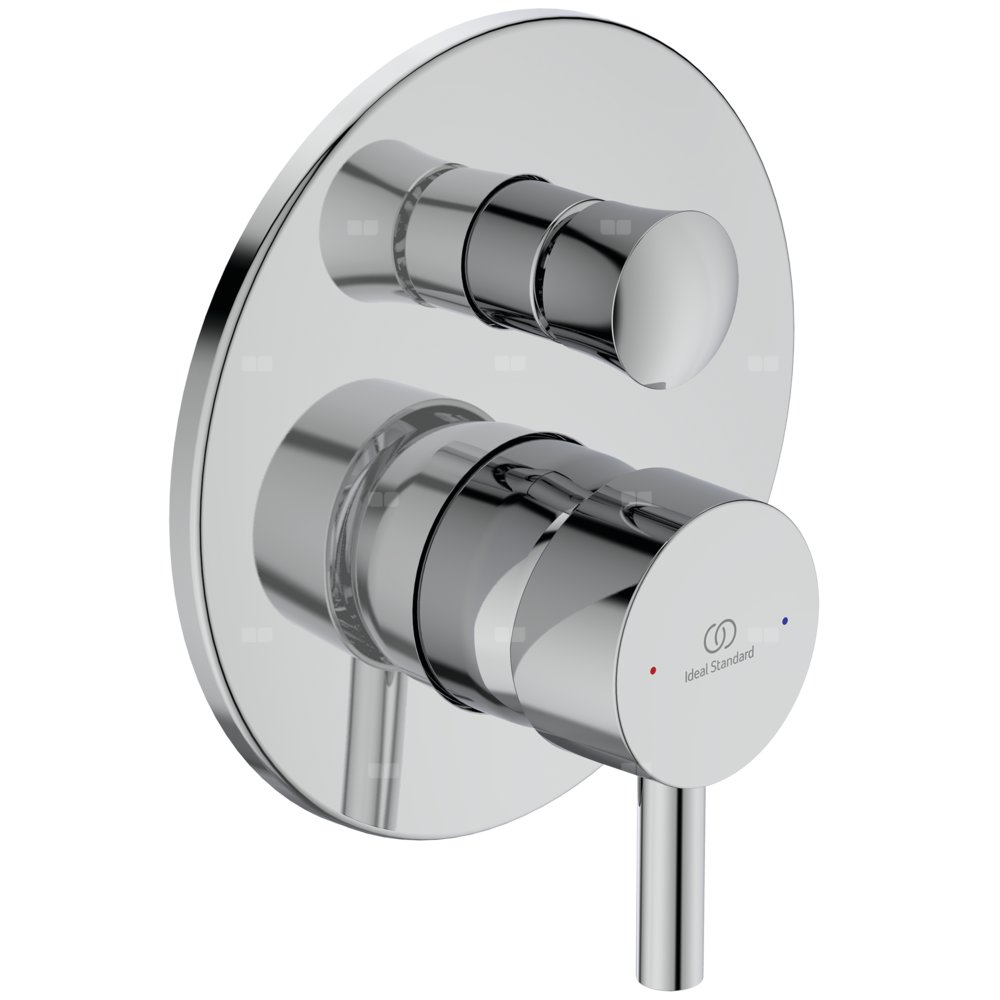 Zestaw montażowy podtynkowej baterii wannowo-natryskowej Ceraline. Głowica Click 47 mm z automatycznym przełącznikiem. Metalowy uchwyt z nadrukowanymi czerwonymi i niebieskimi oznaczeniami, chromowana rozeta z tworzywa.