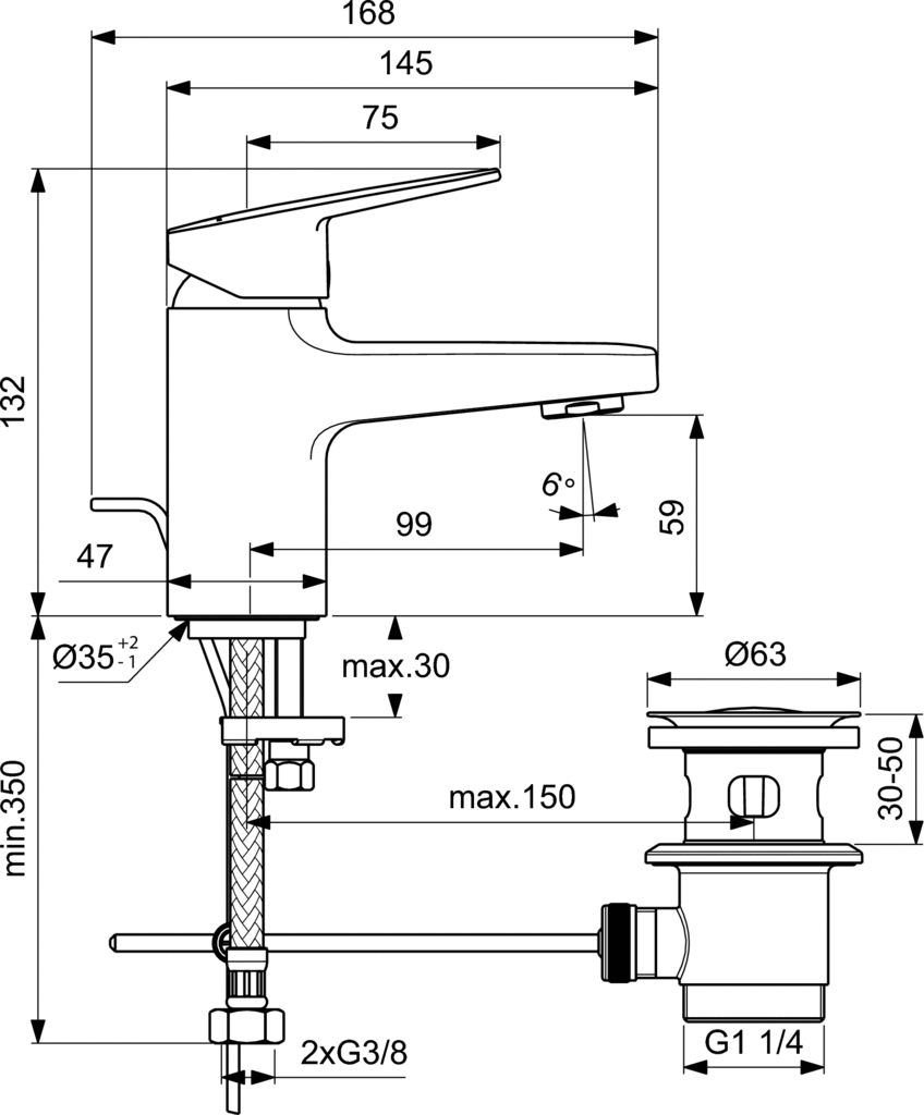 Bateria umywalkowa stojąca. Jednootworowa z obszarem Comfort pod aeratorem: 60 mm. Innowacyjna ceramiczna głowica FirmaFlow 38 mm z ogranicznikiem temperatury. Metalowy uchwyt z nadrukowanymi czerwonymi i niebieskimi oznaczeniami. Smukły aerator z ogranicznikiem przepływu wody do 5 l/min. System montażu Easy-Fix. Wężyki przyłączeniowe G3/8”. Metalowy korek automatyczny.