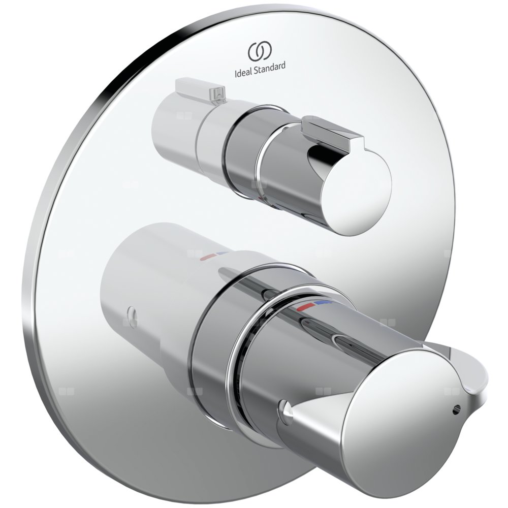 Zestaw montażowy baterii natryskowej termostatycznej Ceraplus 2 pojedynczej podtynkowej. Głowica termostatyczna IS. Ceramiczny zawór talerzowy włącz/wyłącz 90°. Uchwyt z funkcją ograniczenia temp. wody do 40 st. C. Bateria z zaworami zwrotnymi, chromowana metalowa rozeta, funkcja dezynfekcji termicznej. Do skompletowania z uniwersalnym zestawem podtynkowym A1000NU.