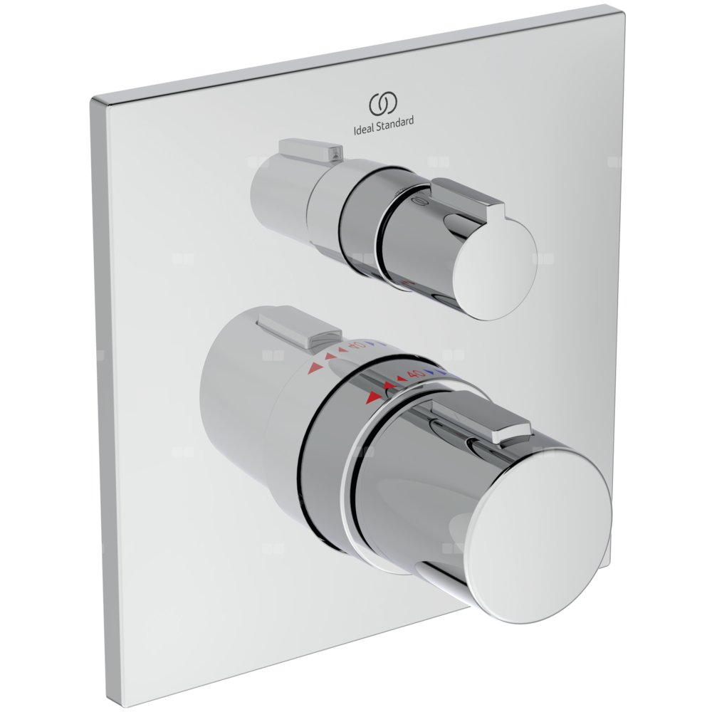 Zestaw montażowy podtynkowej baterii termostatycznej natryskowej (część zewnętrzna). Głowica termostatyczna IS. Ceramiczny zawór talerzowy 3/4'' włącz/wyłącz 90°. Bez przełącznika oraz akcesoriów. Uchwyt z przyciskiem ograniczającym temperaturę wody do 40°C. Metalowa chromowana rozeta o wymiarach 163 mm x 163 mm x 10,5 mm, dodatkowo uszczelniona. Maksymalny przepływ wody przy ciśnieniu 3 bar - 26 l/min. Do skompletowania z elementem montażowym: A1000NU.