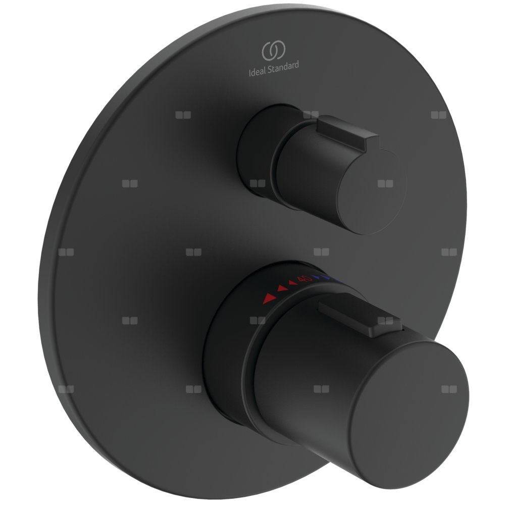 Zestaw montażowy baterii termostatycznej natryskowej podtynkowej (część zewnętrzna). Z głowicą termostatycznną IS (nowa technologia). Ceramiczny zawór talerzowy włącz/wyłącz 90° i przyłączem gwint 3/4''. Bez zintegrowanego przełącznika. Bez akcesoriów w komplecie. Niezbędne wyposażenie: zestaw montażowy A1000NU (część wewnętrzna).