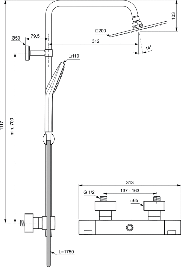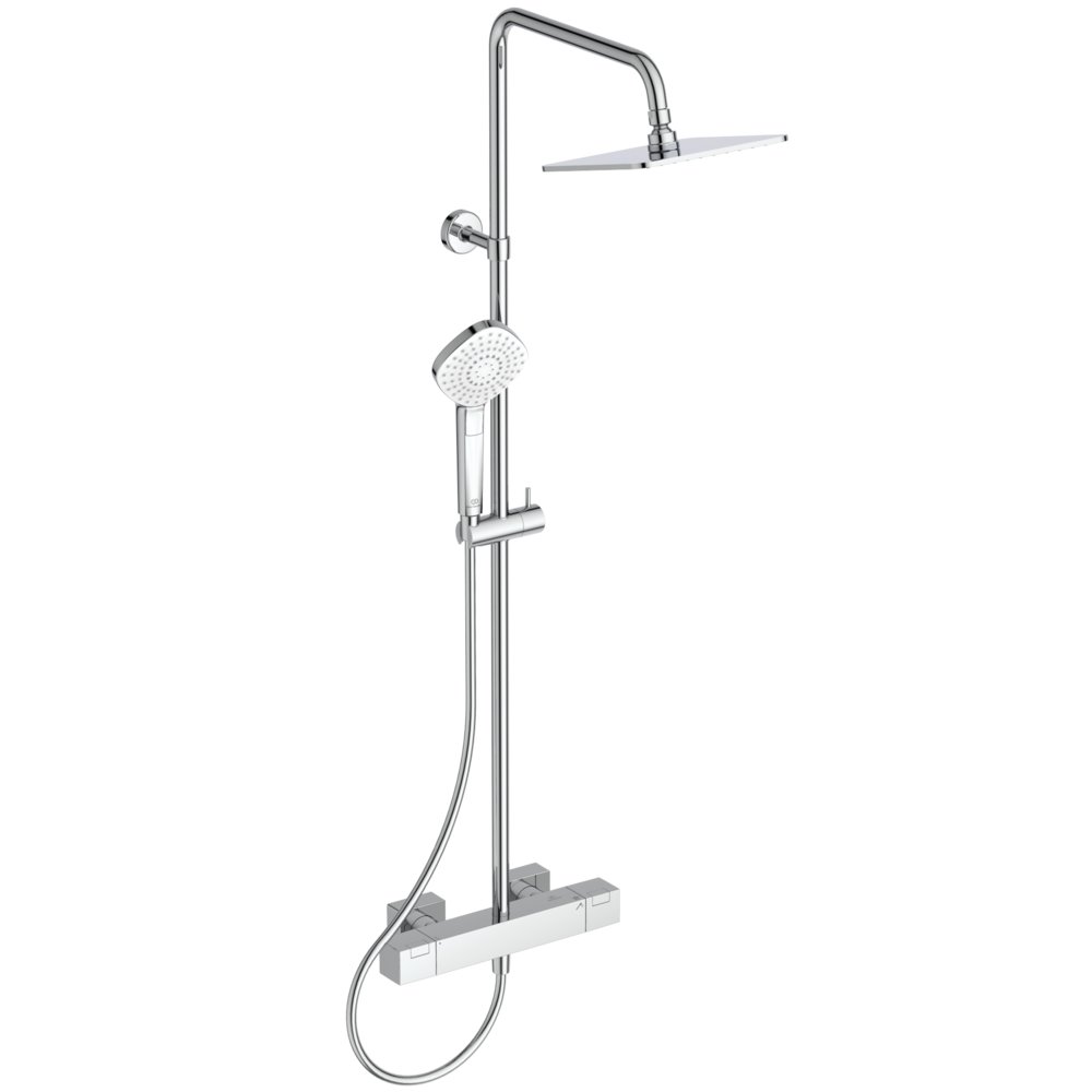 System natryskowy ze ścienną baterią termostatyczną Ceratherm C100 z wkładem FirmaFlow® Therm. Przyłącze S z ukrytymi nakrętkami regulacja strumienia przez zawór ceramiczny, praca w zakresie 180°. Metalowy uchwyt regulacji przepływu wody z przyciskiem redukującym do 50%. Metalowy uchwyt regulacji temperatury do 40°C. Wykorzystuje technologię Cool Body, posiada zawory zwrotne i zintegrowany przełącznik między deszczownicą a słuchawką. Wyposażenie: Deszczownica 200x200 mm (12 l/min), słuchawka prysznicowa 115 mm (8l/min), regulowany w pionie metalowy uchwyt do mocowania na ścianie oraz wąż prysznicowy IdealFlex 1750 mm.