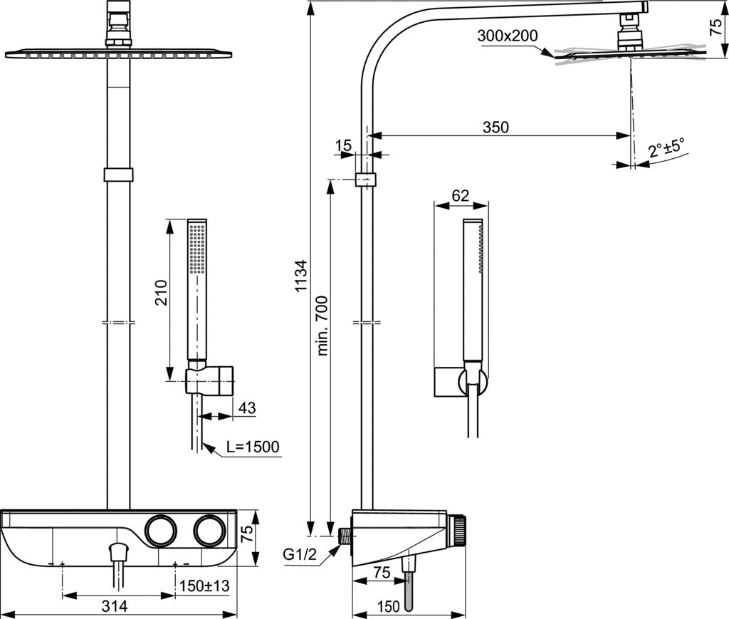 Ukryte przyłącza mimośrodowe, zintegrowane z korpusem baterii. Głowica termostatyczna IS nowej technologii. Regulacja temperatury termostatu przez pokrętło. Uchwyt z ogranicznikiem temperatiry do 40°C. Regulacja mocy przepływu przez pokrętło, głowica ceramiczna G1/2’’ 90°. Funcja ECO redukcjąca przepływ wody wody o 50%. Łatwe użytkowanie dzięki pokrętłom umiejscowionym od frontu. Przełącznik deszczownica/słuchawka zintegrowany w w pokrętle regulacji przepływu. Półka wykonana z bezpiecznego szkła w kolorze białym. Przyłącze natryskowe G1/2". Zintegrowane zawory zwrotne w przyłączach baterii. Funkcja Cool body zapobiegająca poparzeniu przez korpus baterii. Metalowa deszczownica 300x200 mm z ogranicznikiem przepływu wody do 12 l/min. Minisłuchawka prysznicowa, z ogranicznikiem przepływu wody do 8 l/min. Element przepływowy o prostokątnym kształcie. Mocowania ścienne do szybkiego montażu z regulacja pionowa dającą możliwość instalacji w istniejących otworach ściennych. Wykonane z metalu ścienne regulowane mocowanie słuchawki. Wąż Idealflex długości 1600 mm.