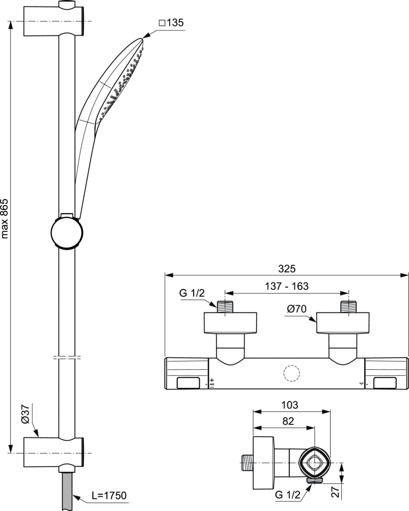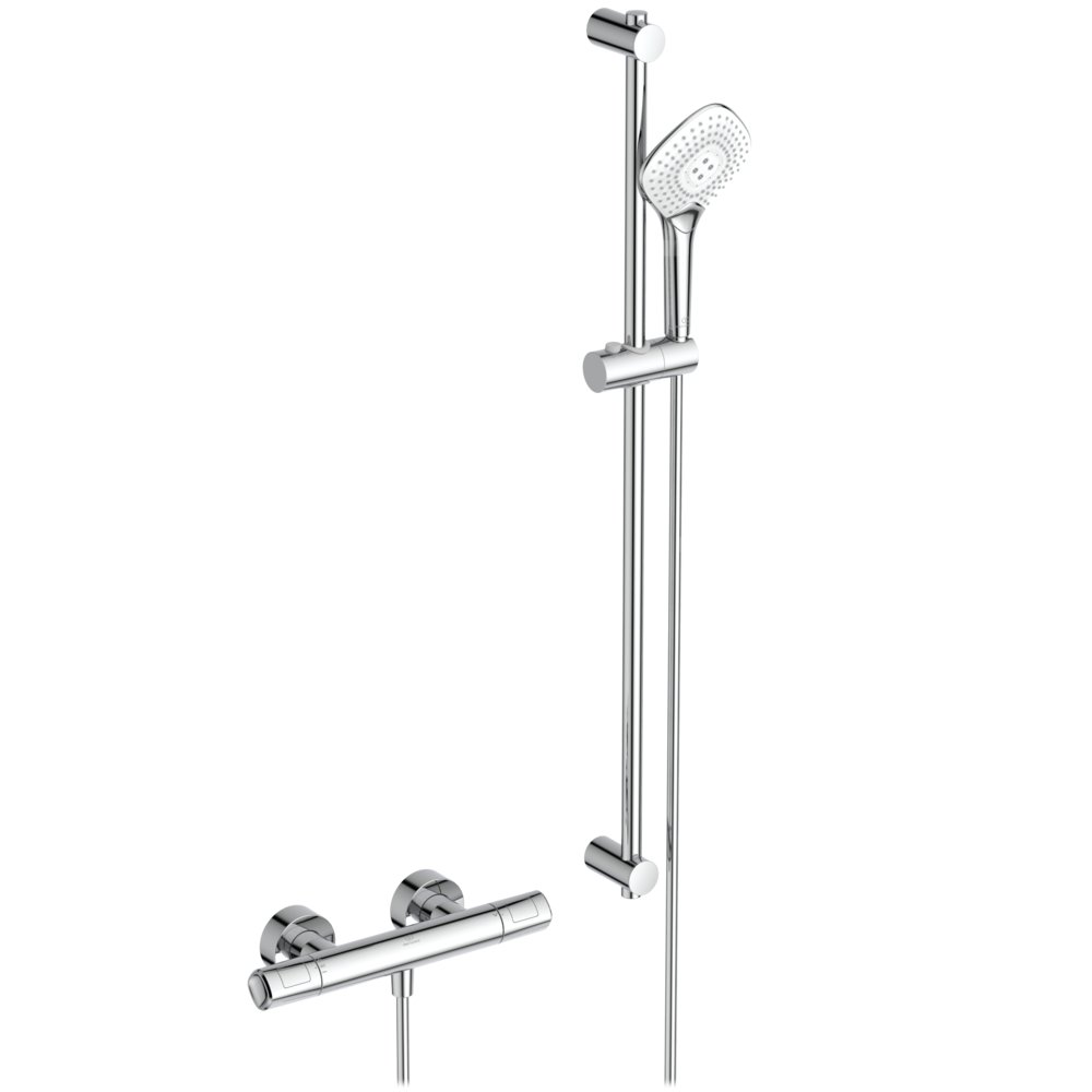 Bateria termostatyczna natryskowa naścienna z akcesoriami. Ukryte przyłącza mimośrodowe. Głowica termostatyczna IS nowej technologii. Ceramiczny zawór G1/2 180°. Diamentowy uchwyt z ogranicznikiem temperatury do 40°C i przyciskiem redukującym przepływ wody o 50%. Zawór zwrotny. W komplecie zestaw natryskowy: słuchawka natryskowa 125 mm 3-funkcyjnaEvo Jet Diamond, z ogranicznikiem przepływu 8l/min. wąż natryskowy 1750 mm Idealflex oraz drążek natryskowy 900 mm z regulacją punktów mocowania do ściany. Zalecane dodatkowe elementy: nakładana półka do baterii termostatycznych Ceratherm T25, T50 i T100 A7215AA.