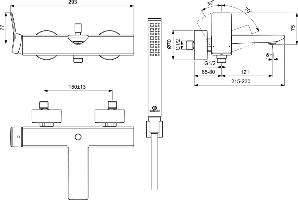 Głowica ceramiczna 38 mm z ogranicznikiem temperatury wody. Logo Ideal Standard umieszczone na korpusie baterii. Metalowy uchwyt bez oznaczeń. Zawór zwrotny. Osłonięte i wyciszone przyłącza ścienne. Aerator typu M24x1. Automatyczny przełącznik wanna/natrysk. Akcesoria: metalowa minisłuchawka. Wąż natryskowy IdealFlex 1600mm. Prostokątny uchwyt ścienny słuchawki.
