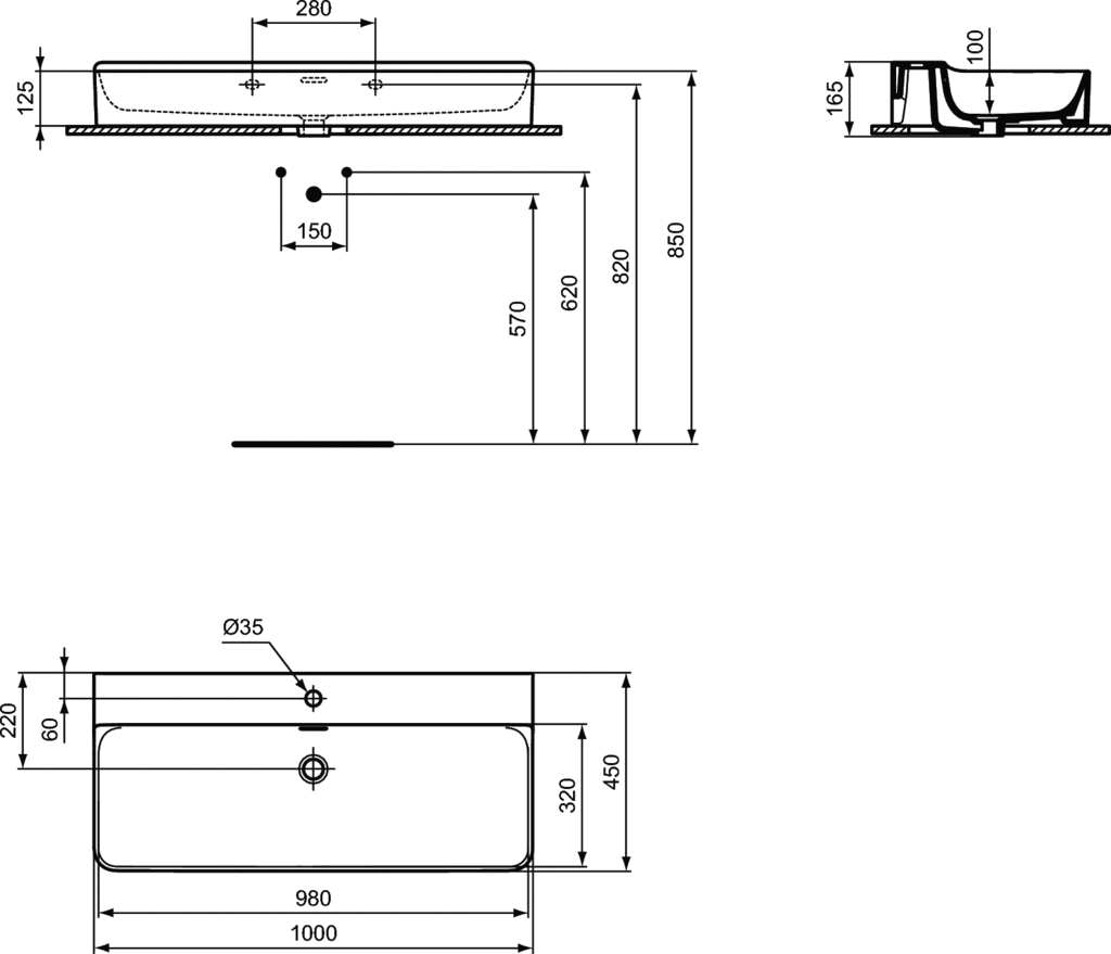 Umywalka Conca mocowana do ściany z 1 wybitym otworem na baterię oraz przelewem (kształt szczelinowy).