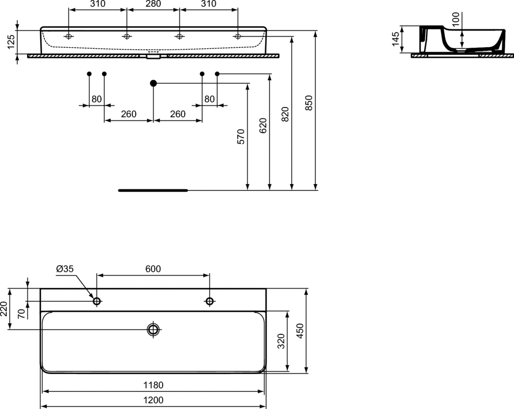 Umywalka mocowana do ściany bez przelewu. Opcjonalnie: rekomendowany zestaw montażowy WW965340, dekoracyjny syfon G1 1/4 E0079AA (do montażu z/bez pólpostumentu lub podstawowej szafki), zawór kątowy odcinający A3491AA; Rozeta do syfonu G1 1/4 (do montażu z baterią bez korka automatycznego) - B4801AA.
