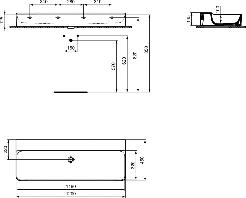 Umywalka mocowana do ściany bez przelewu. Opcjonalnie: rekomendowany zestaw montażowy WW965340, dekoracyjny syfon G1 1/4 E0079AA (do montażu z/bez pólpostumentu lub podstawowej szafki), zawór kątowy odcinający A3491AA; Rozeta do syfonu G1 1/4 (do montażu z baterią bez korka automatycznego) - B4801AA.