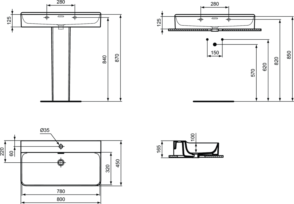Umywalka mocowana do ściany z przelewem (kształt szczelinowy). Opcjonalnie: rekomendowany zestaw montażowy WW965340, dekoracyjny syfon G1 1/4 E0079AA (do montażu z/bez pólpostumentu lub podstawowej szafki), zawór kątowy odcinający A3491AA; Rozeta do syfonu G1 1/4 (do montażu z baterią bez korka automatycznego) - B4801AA. Postument do umywalek mocowanych do ściany: T388101.