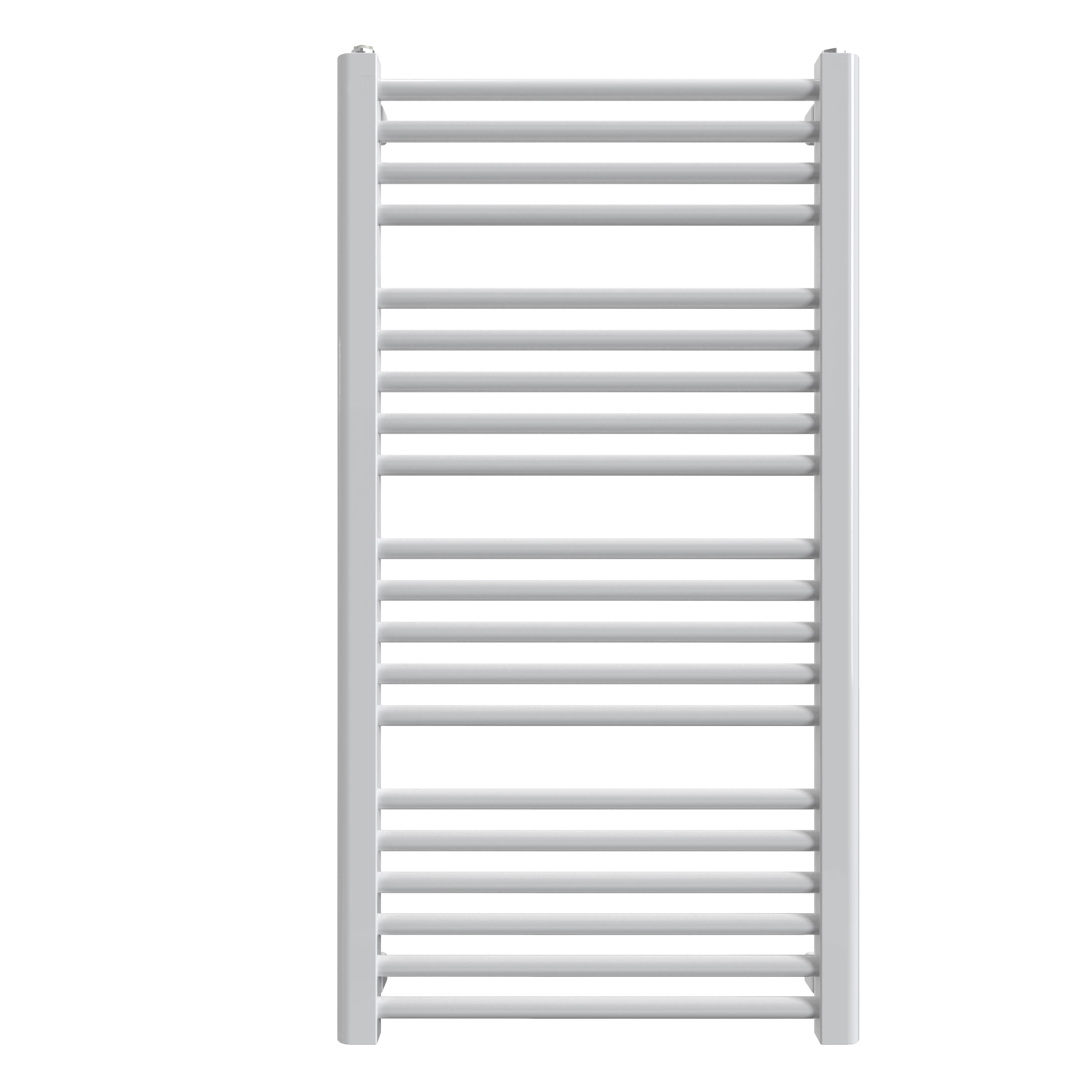 Grzejnik łazienkowy w kolorze białym. Typ: GRN - grzejnik pionowy łazienkowy. Materiał: stal niskowęglowa niestopowa. Konstrukcja: kolektor profil "D" 40 x 30, rury DN 20. Wysokość: 620, 740, 940, 1180, 1340, 1500, 1700, 1820 mm, szerokość: 400, 500, 600 mm. Ciśnienie robocze do 1,0 MPa. Temp. pracy do 95°C. Wyposażenie standardowe: korek 1/2", odpowietrznik 1/2", zawieszenie grzejnikowe typ Z 13. Wykończenie powierzchni: kolor biały. Przyłącza 1/2" GW.