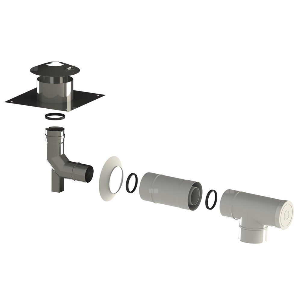 Zestaw spalinowo-powietrzny w szacht kominowy zbudowany z poziomego koncentrycznego odcinka, który tworzy czopuch, umożliwiający podłączenie kotła kondensacyjnego do kanału kominowego. W szachcie montuje się kolano z podporą, które jest elementem bazowym części pionowej zestawu. Komin zwieńczony płytą dylatacyjną z kołnierzem, umożliwiającą wyrzut spalin z części pionowej i jednoczesne czerpanie świeżego powietrza do spalania. Wewnątrz szachtu umiejscowiono osiowo względem jego ścian stalowe rury spalinowe, odprowadzające spaliny na zewnątrz budynku. Zestaw zawiera: trójnik 87° rewizyjny, rurę dł. 250 mm, kolano z podporą 87°, kołnierz, króciec dylatacyjny z kołnierzem, uszczelkę silikonową fi=80 (wewnętrzną; 3 szt.)