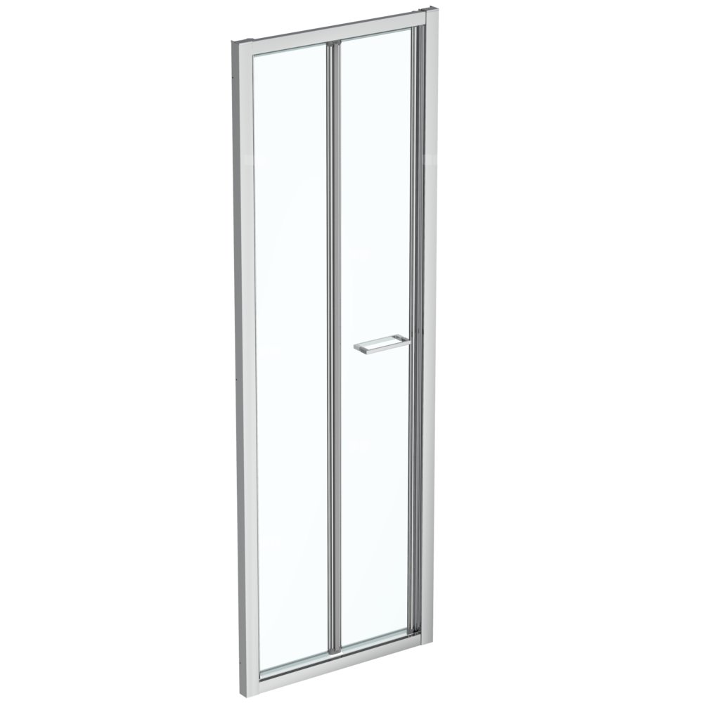 CONNECT 2 Drzwi prysznicowe składane. Wysokość 195 cm. Bezpieczne, hartowane, szkło grubości 6 mm. Szkło przeźroczyste pokryte w standardzie powłoką IDEAL CLEAN ułatwiającą utrzymanie czystości. Profile aluminiowe dostępne w kolorach srebrnym połysk i biały mat. Wygodne metalowe uchwyty drzwi długości 225 mm w kolorze chrom. Profile ułatwiające montaż i dostosowanie wymiarów kabiny w zakresie do 25 mm. Drzwi składane na zewnątrz i do wewnątrz do montażu we wnęce lub do skompletowania z wybraną ścianką boczną jako kabina narożna. Możliwość montażu bezpośrednio na podłodze lub skompletowania z odpowiednimi brodzikami Ideal Standard. Zalecane dodatkowe elementy: CONNECT 2 Ścianka boczna w wybranym rozmiarze. Uwaga: Drzwi kabiny są odwracalne.