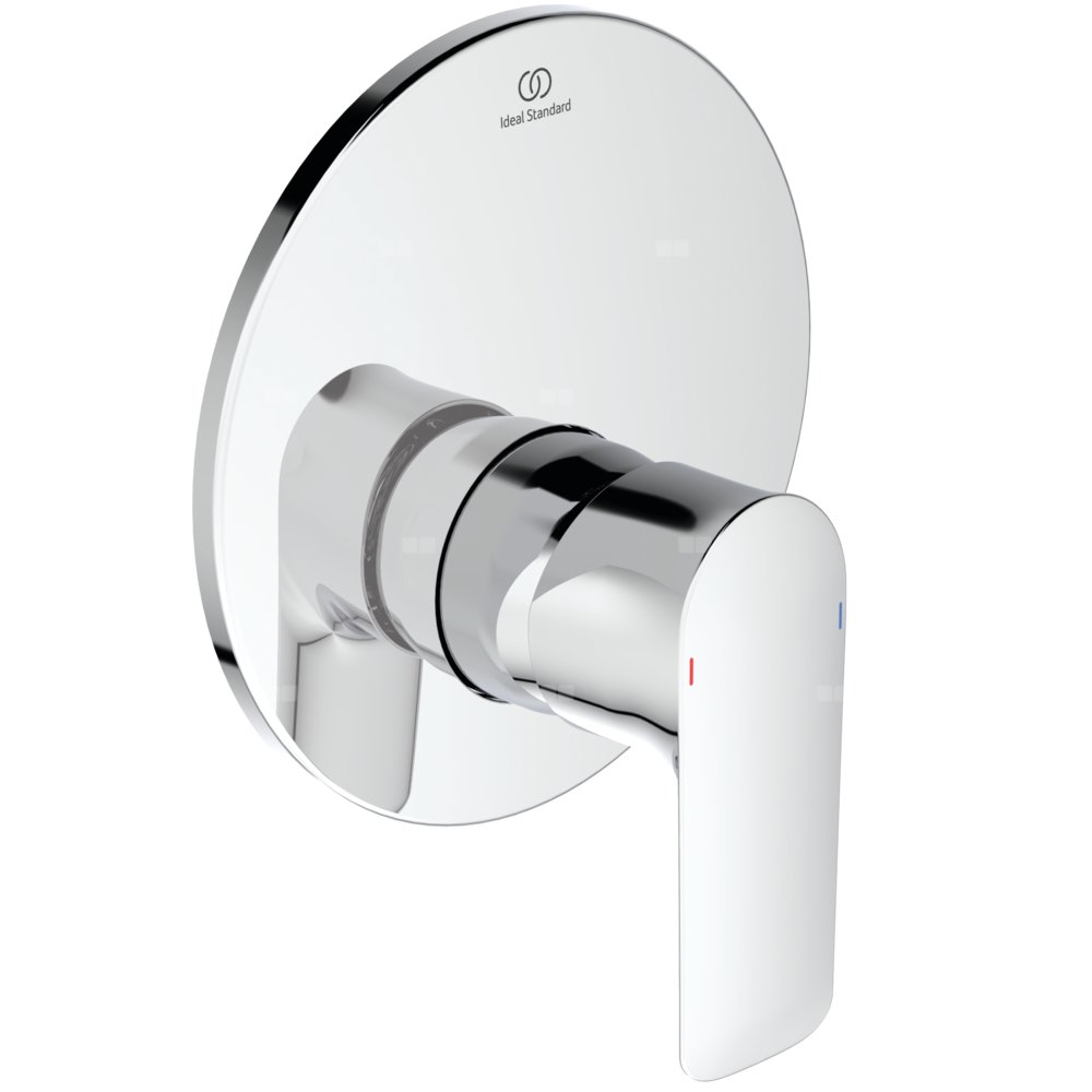 Zestaw montażowy podtynkowej baterii natryskowej. Głowica ceramiczna IS 47 mm. Metalowy uchwyt z nadrukowanymi czerwonymi i niebieskimi oznaczeniami, chromowana rozeta z tworzywa sztucznego. Do skompletowania z uniwersalnym zestawem podtynkowym A1000NU.