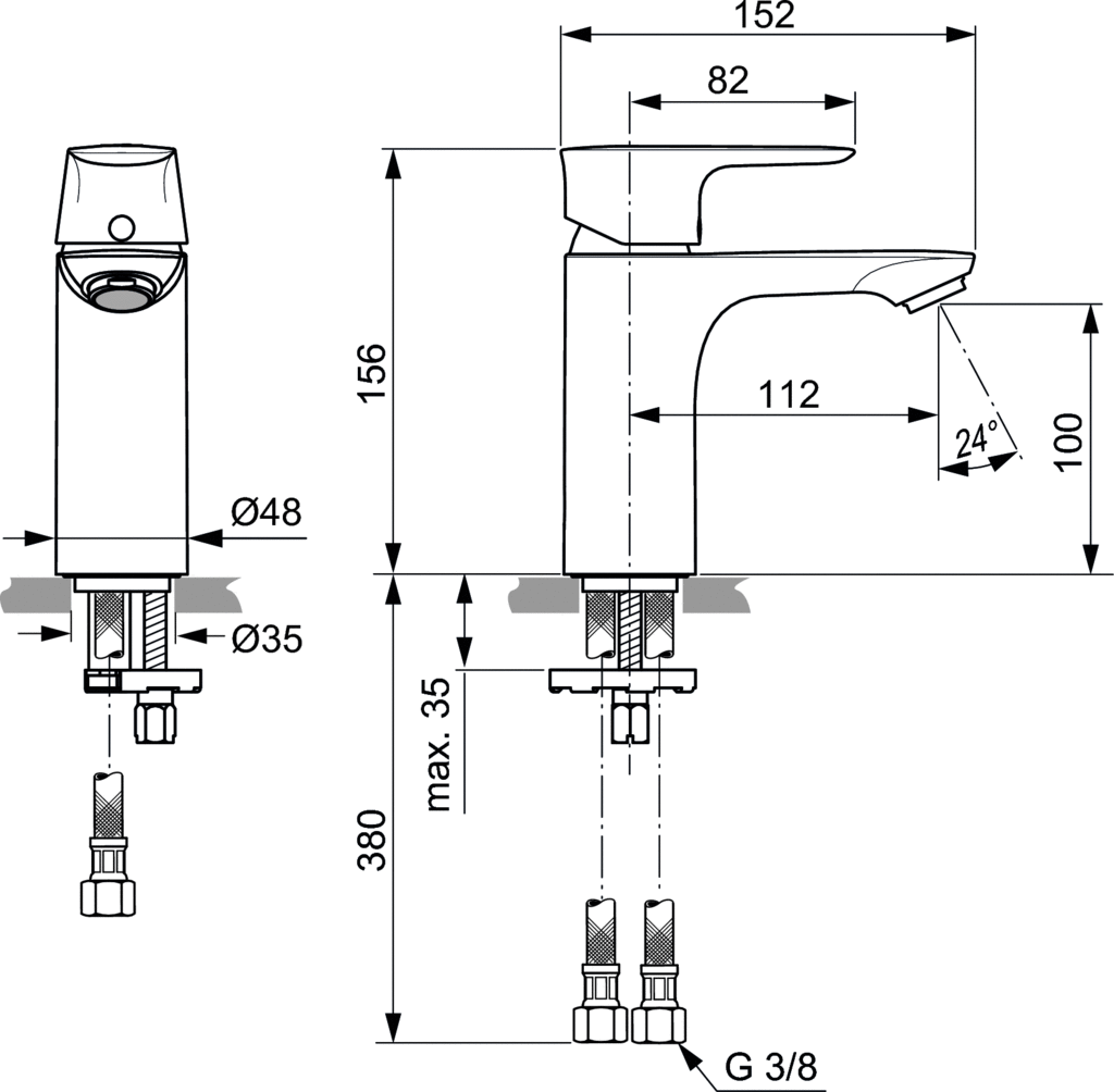 Bateria umywalkowa jednootworowa bez metalowego korka automatycznego. Mosiężny, odlewany korpus 48 mm. Metalowy uchwyt z nadrukowanymi czerwonymi i niebieskimi oznaczeniami, mocowanie uchwytu przedniego, chromowany przycisk. Aerator typu Perlator M24x1 - 5l/min, głowica FirmaFlow 38 mm z ogranicznikiem temperatury. Brak funkcji Click. Wężyki przyłączeniowe PEX G3/8".