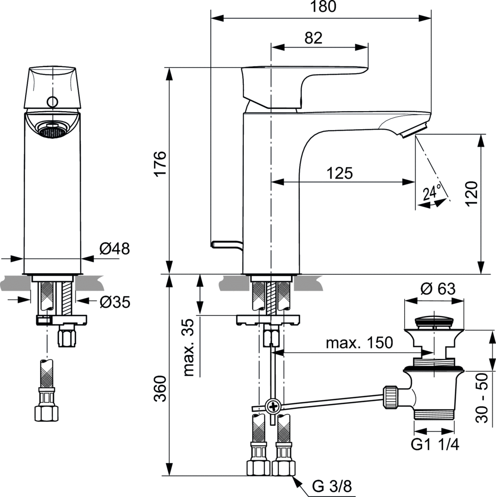 Bateria umywalkowa jednootworowa Grande z metalowym korkiem automatycznym. Mosiężny, odlewany korpus 48 mm. Metalowy uchwyt z nadrukowanymi czerwonymi i niebieskimi oznaczeniami. Mocowanie uchwytu przedniego. Chromowany przycisk. Aerator typu Perlator M24x1 - 5l/min. Głowica FirmaFlow 38 mm z ogranicznikiem temperatury, brak funkcji Click. Wężyki przyłączeniowe PEX G3/8".