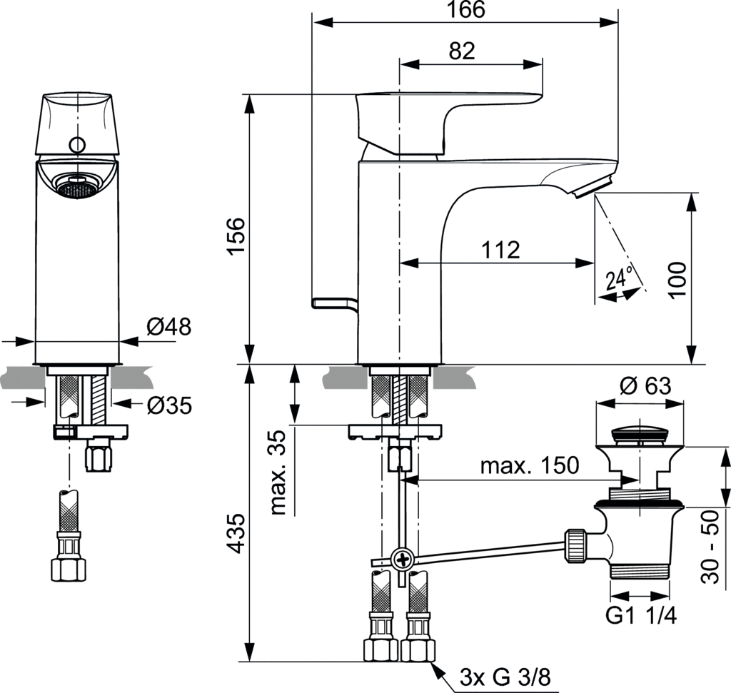 Bateria umywalkowa jednootworowa do niskiego ciśnienia ND. Mosiężny, odlewany korpus 48 mm. Metalowy uchwyt z nadrukowanymi czerwonymi i niebieskimi oznaczeniami. Metalowy korek automatyczny, mocowanie uchwytu przedniego, chromowany przycisk. Aerator typu Perlator M24x1 ND, głowica FirmaFlow 38 mm bez ogranicznika temperatury. Brak funkcji Click. Wężyki przyłączeniowe PEX G3/8" (3 szt.).
