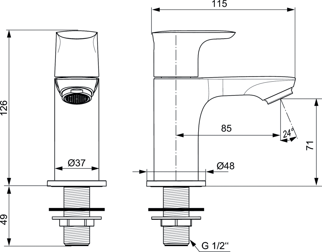 Bateria umywalkowa z nową nakładką na uchwyt z logo Ideal Standard (bez oznaczeń kolorystycznych). Metalowy uchwyt z nadrukowanymi czerwonymi i niebieskimi oznaczeniami. Mocowanie uchwytu przedniego, gumowy przycisk (szary). Elastyczne wężyki przyłączeniowe PEX G3/8". Perlator M24x1 - 5l/min. Zgodna z EN820.