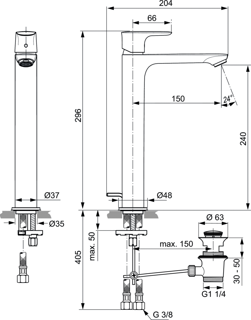 Bateria umywalkowa nablatowa jednootworowa z metalowym korkiem automatycznym. Smukły metalowy korpus, wysoka bateria do umywalek nablatowych. Metalowy uchwyt z nadrukowanymi czerwonymi i niebieskimi oznaczeniami. Aerator typu Perlator M24x1 - 5l/min, głowica 25 mm bez ogranicznika temperatury. Wężyki przyłączeniowe PEX G3/8".